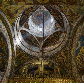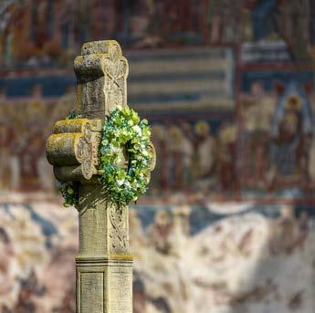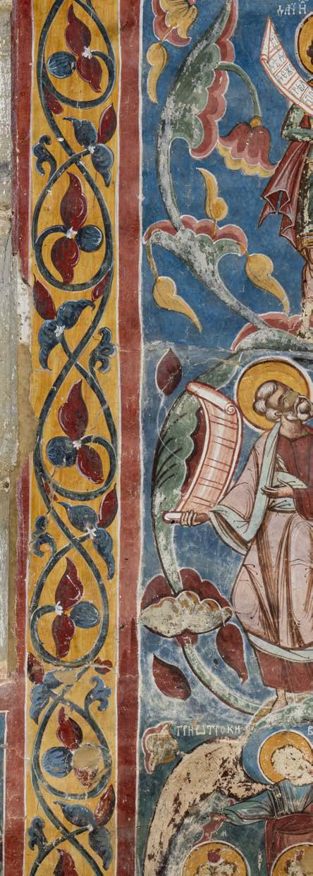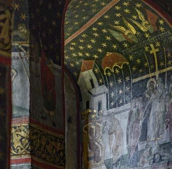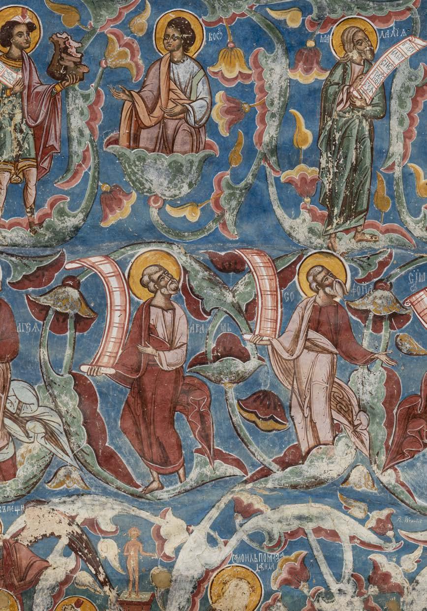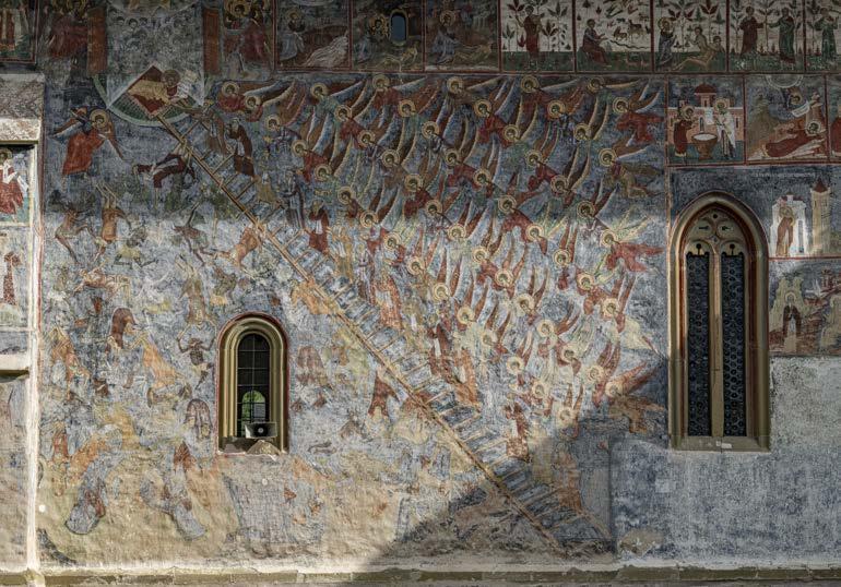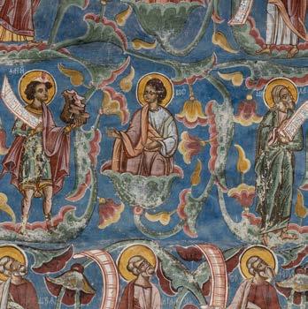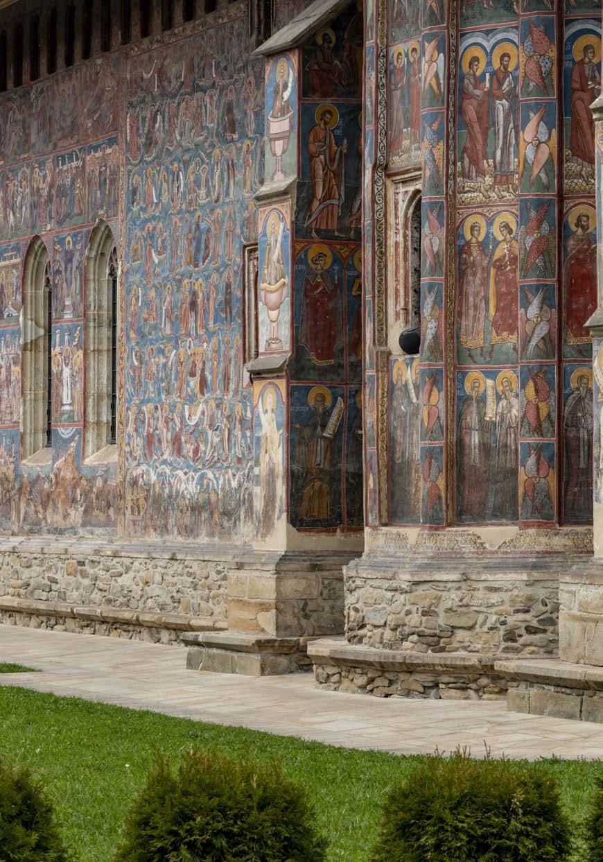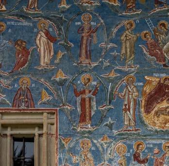 tagne vicine, mentre Sucevița si distingue per il suo verde profondo, che dialoga con i boschi circostanti e accompagna le figure di angeli, patriarchi e profeti.