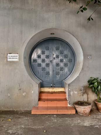 Nelle pagine precedenti, a sinistra in alto, il Matrimandir, simbolo di Auroville; sotto, scorcio del quartiere Tamil a Pondicherry. Nella pagina a fianco, un angolo di Le Jardin Suffren, Garden Cafè & Guest House, Pondicherry.