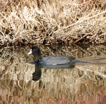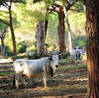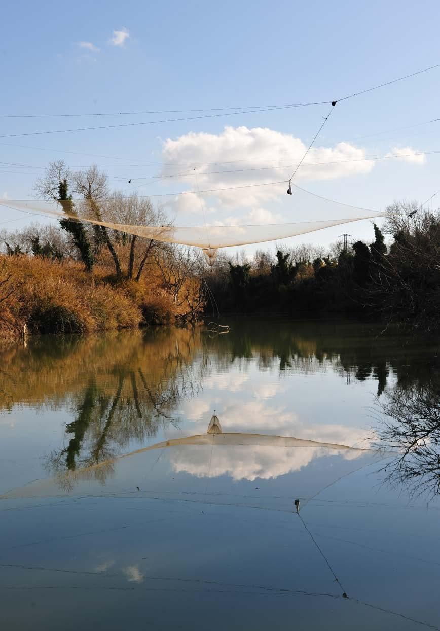 In basso: vacche maremmane, dalle caratteristiche corna a lima, nella pineta della Piana dei Cavalleggeri. Piccole aeree, durante i mesi più piovosi, si allagano e diventano siti per uccelli acquatici. Una folaga galleggia negli stagni che si formano dopo le precipitazioni primaverili. Nella pagina accanto, pesca fluviale con vecchi sistemi nelle acque dell’Ombrone, ricche di pesci.