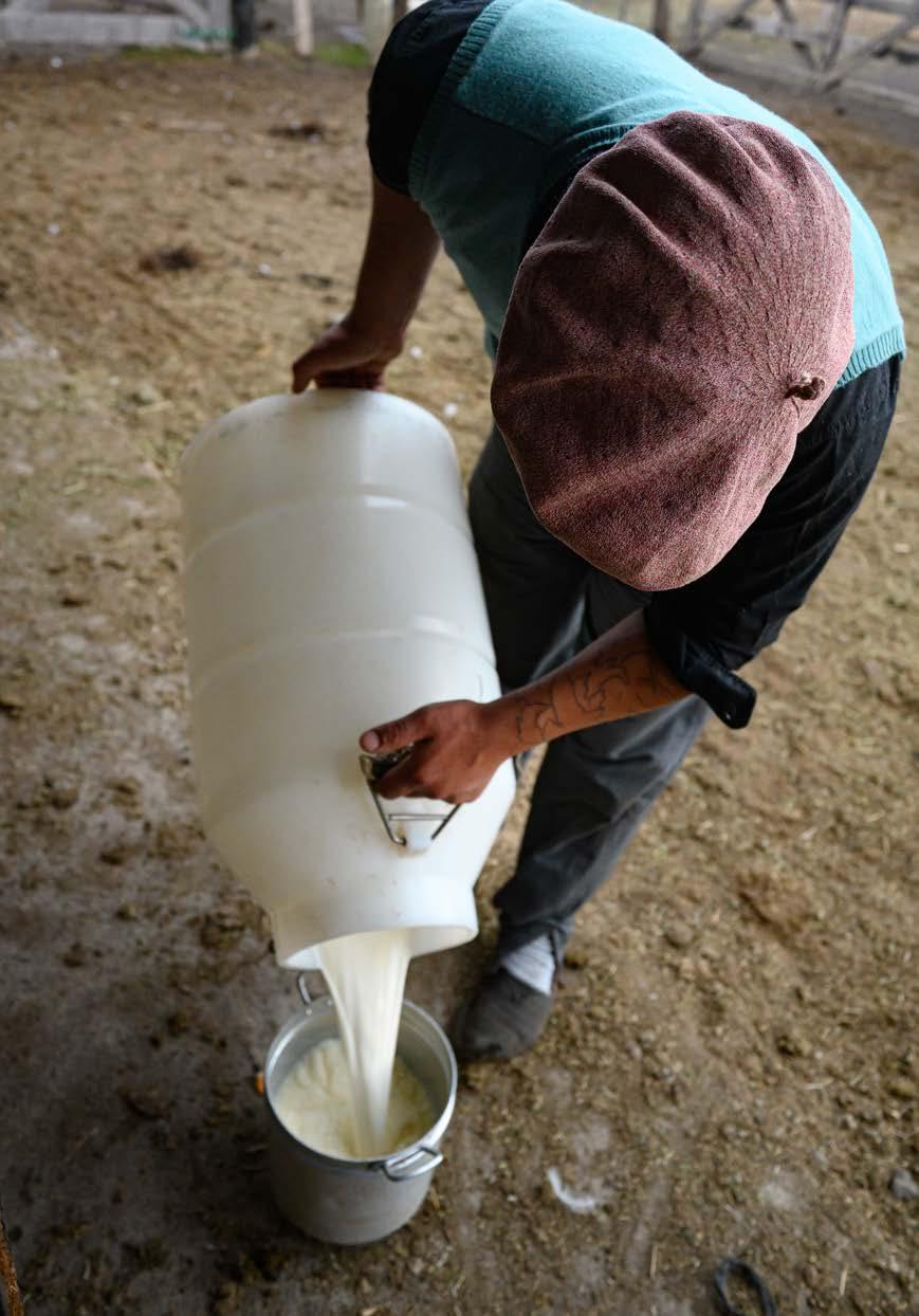 Nella pagina accanto, latte appena munto. In alto, una delle finestre che connettono il fuori e dentro: le nuvole, come i pensieri e i sentimenti, entrano ed escono in un continuum.