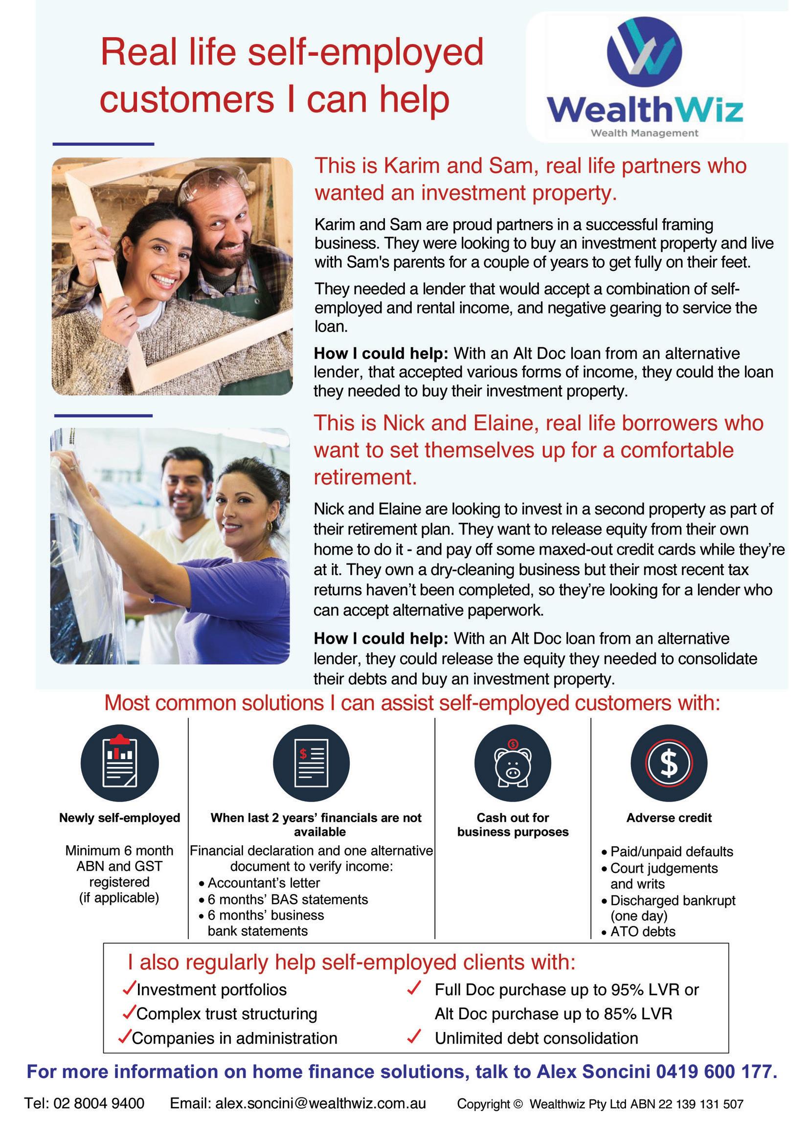 Contact Alex Soncini today to discuss your needs: Call 0419 600 177 or email alex.soncini@wealthwiz. com.au.