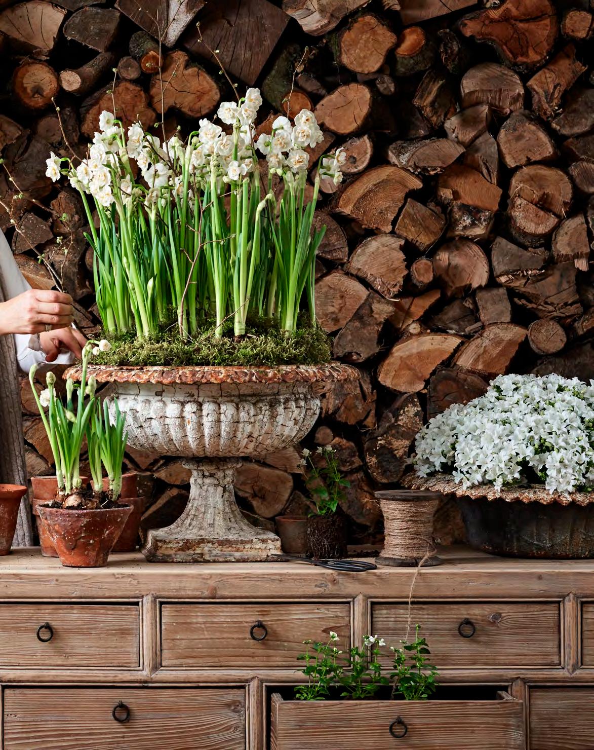 The classic variety for forcing is the Narcissus ‘Ziva’ Paperwhite, which has a height of 40cm, but pretty much any of the N. Tazetta varieties will work. I pot-up a ramshackle array of vessels of various shapes and sizes; vintage ceramic jelly moulds, a pair of shallow terracotta planters splattered with lichen, and a series of plasticlined wicker baskets.