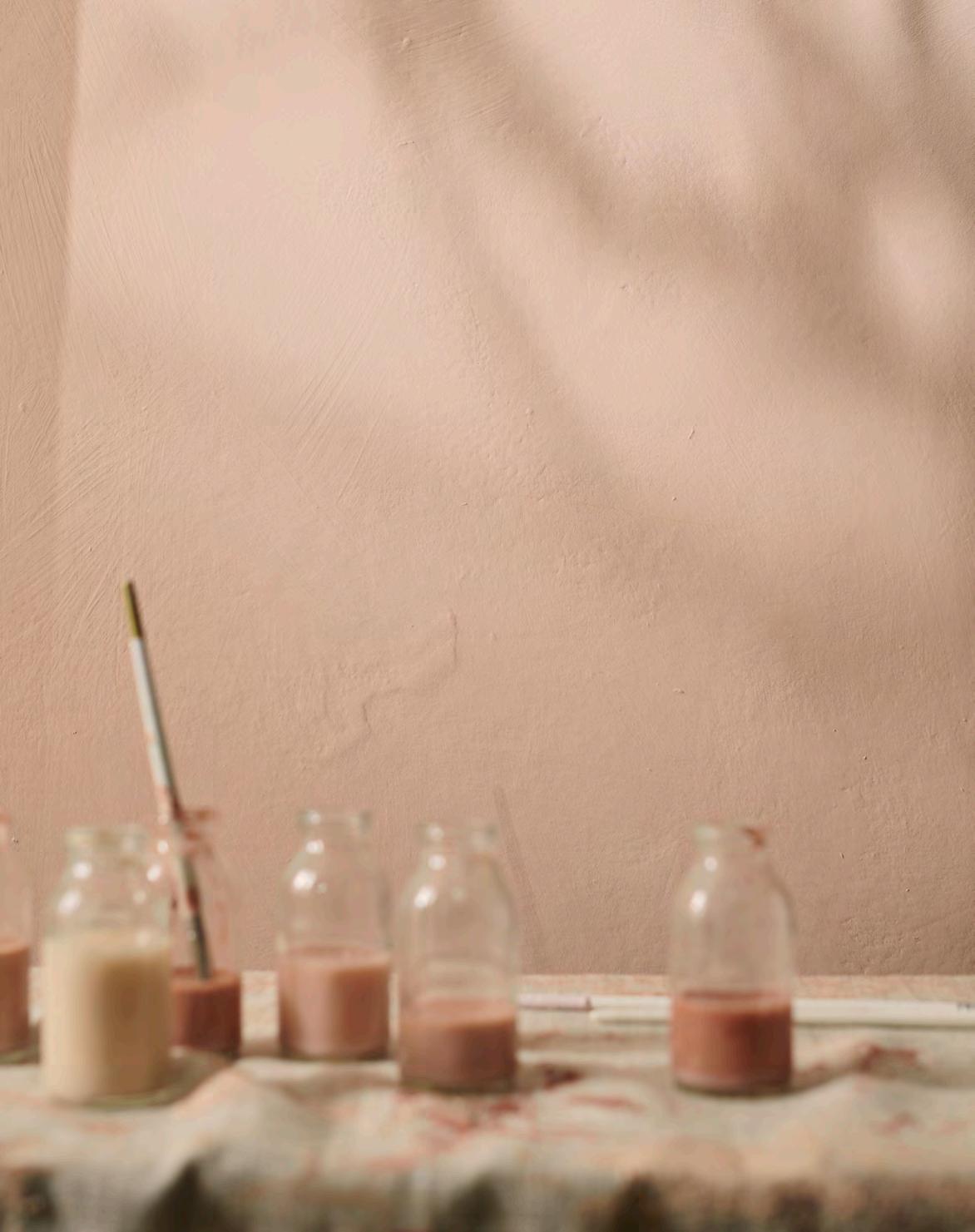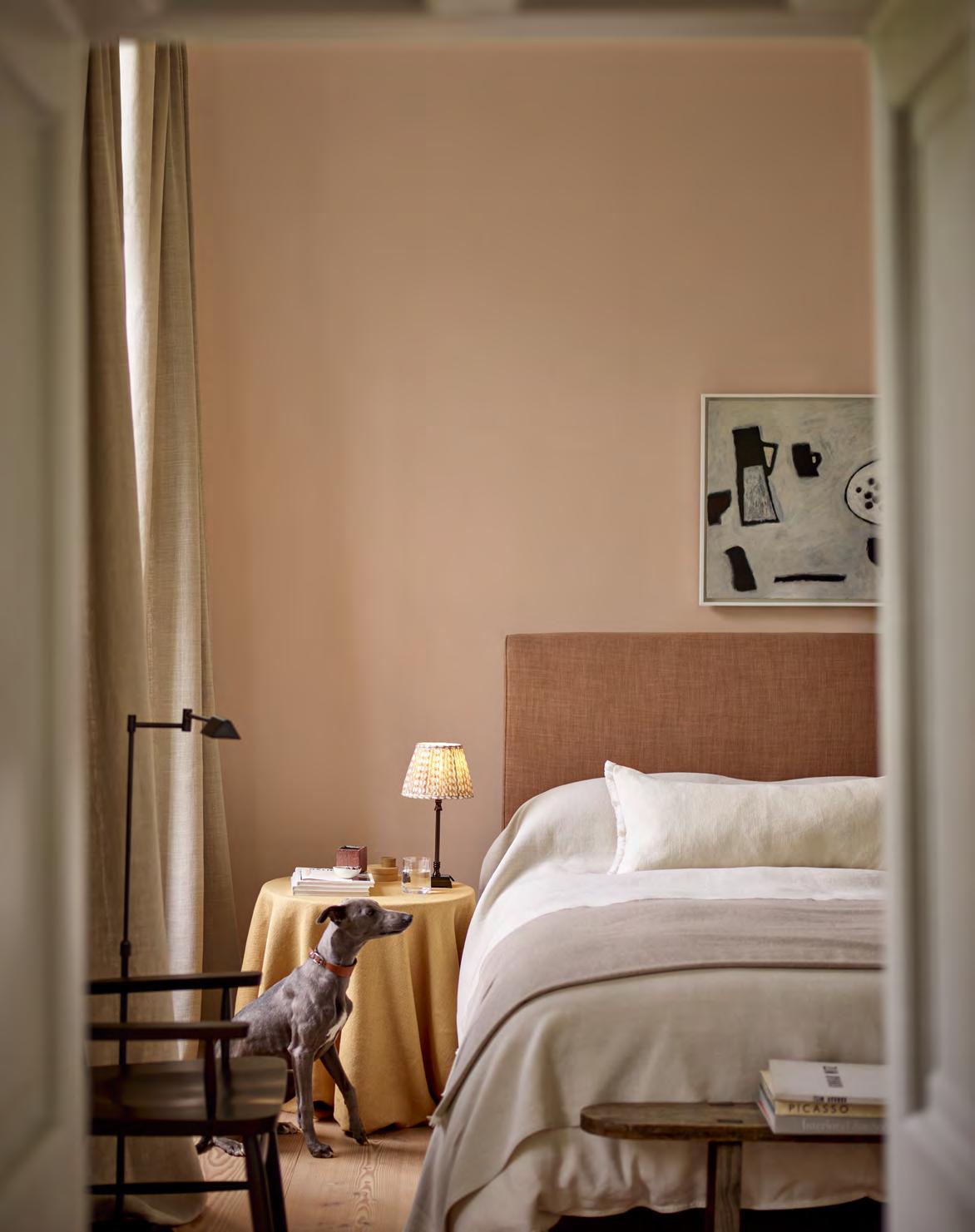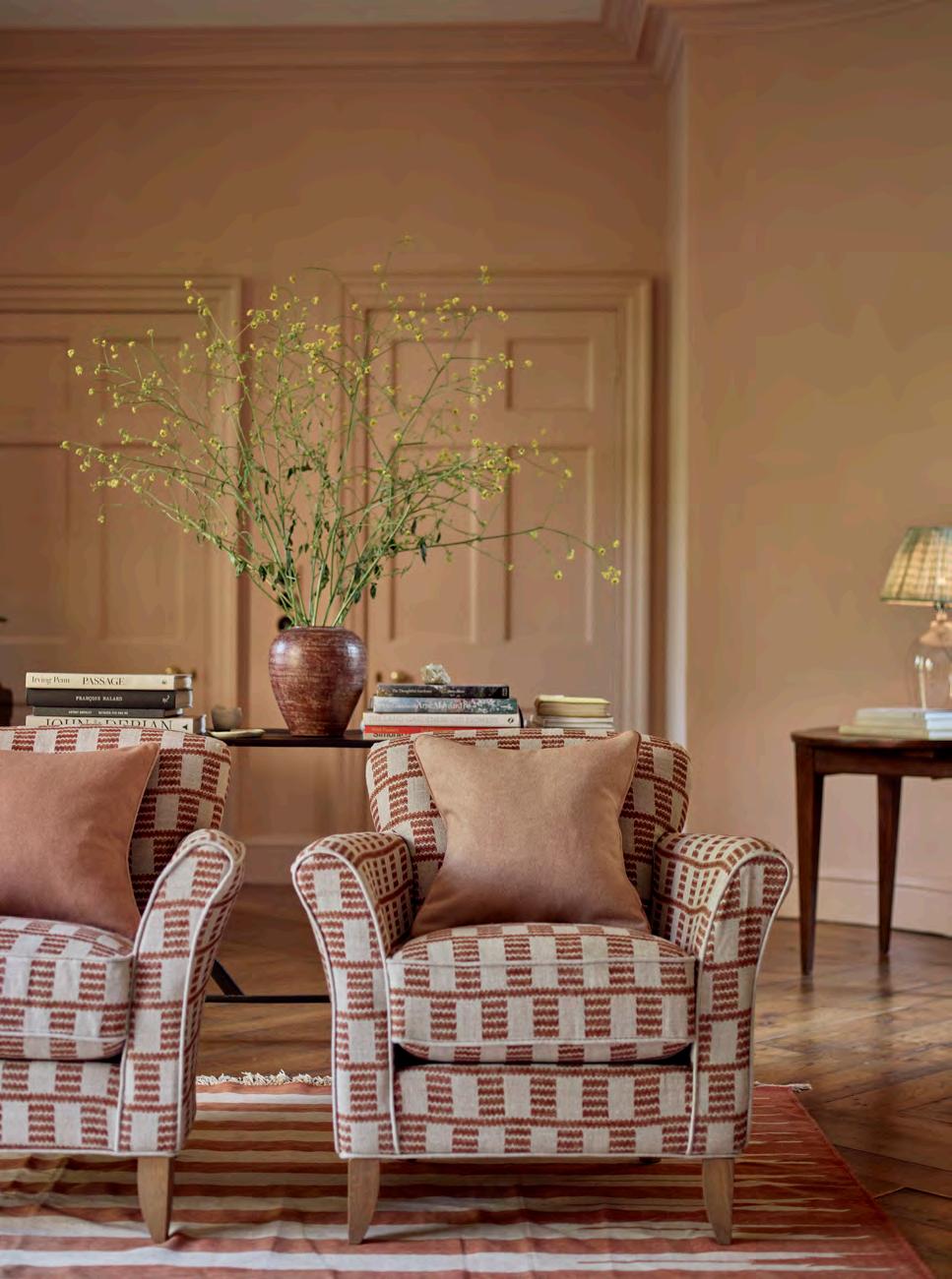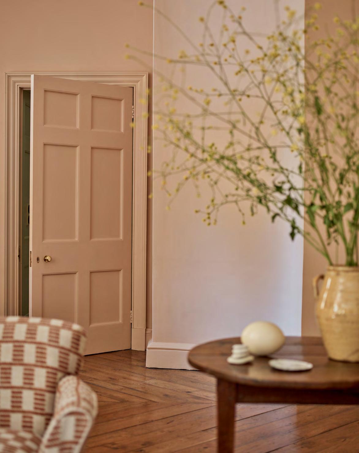 In this sitting room, our seasonal shade Potter’s Pink accounts for 60% of the scheme, with a warm neutrality that’s perfect for decorating whole rooms. Shades of brown make up 30% through timber furniture and the deep rust colour of the Fermoie fabric on our Matilda armchairs and the stripes on the rug. Finally, the fresh green of the scatter cushion and the decorative foliage account for 10%.