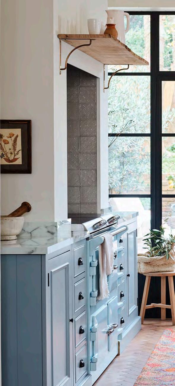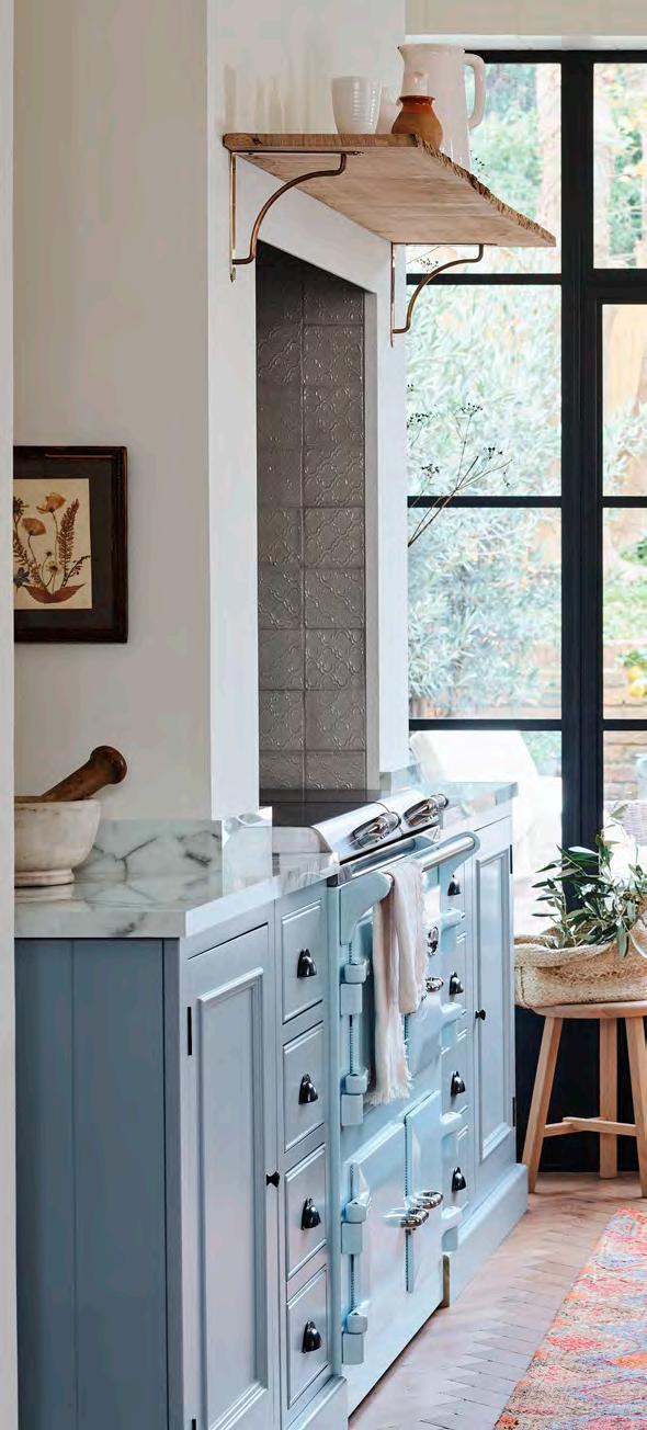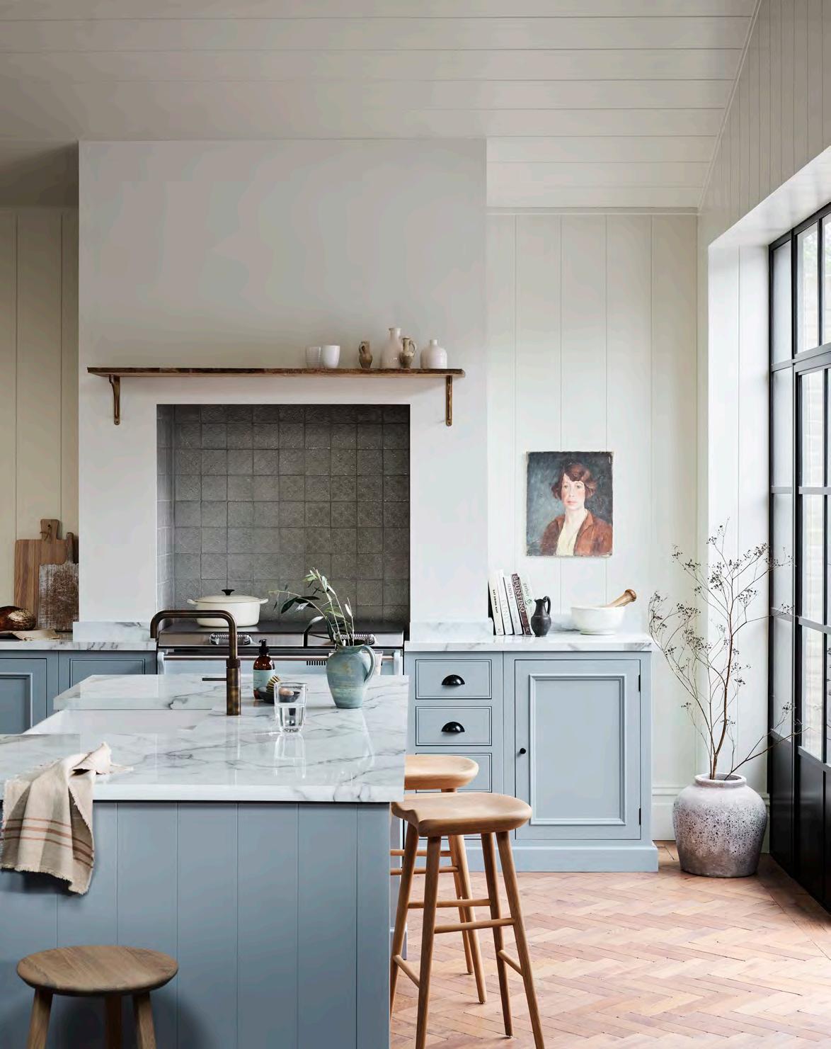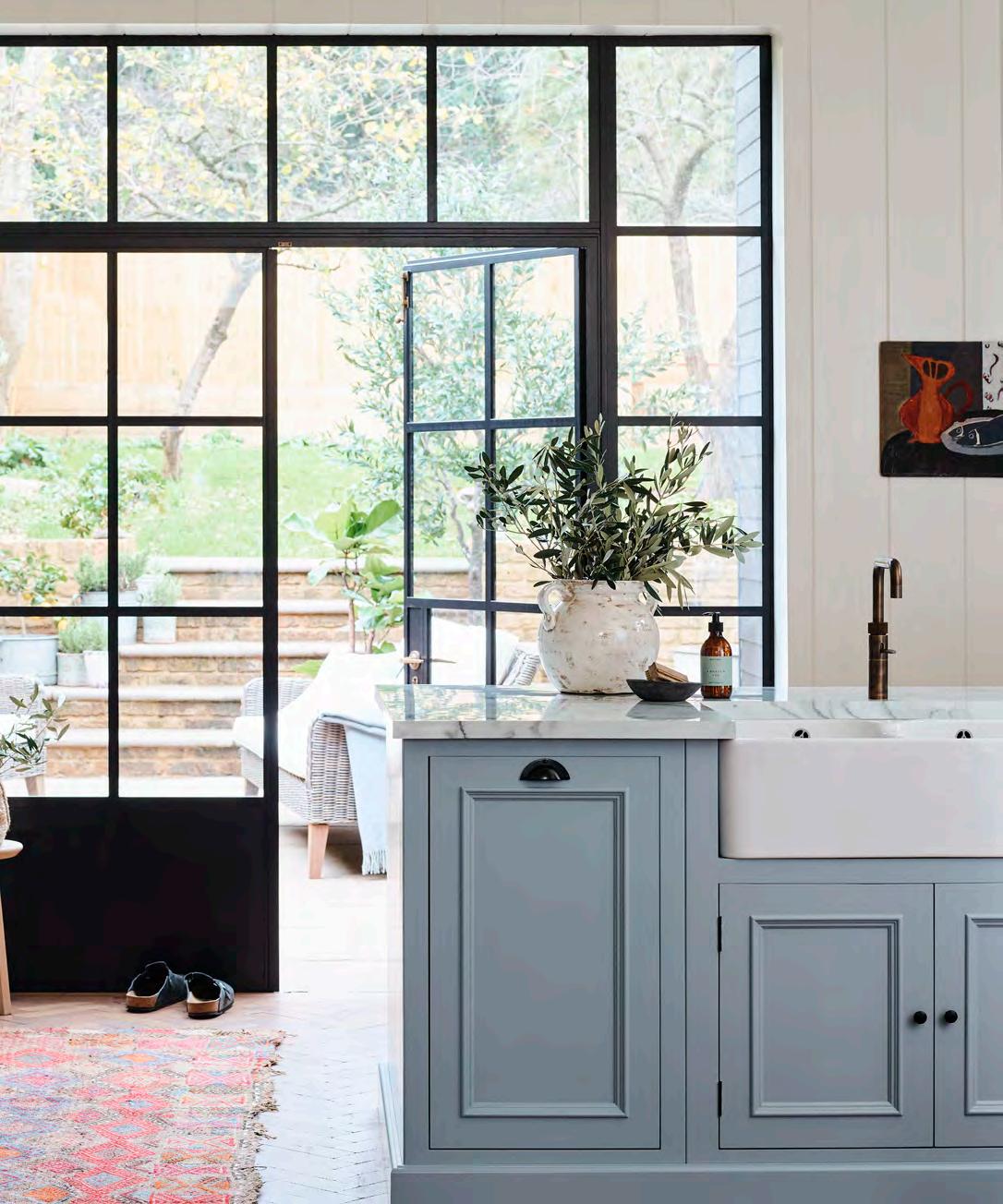 This, then, is a kitchen of juxtapositions; from the rich black-bronze hardware that offers a welcome contrast to the lightness of the Flax Blue cabinetry, to the sleek silhouette of an industrial style tap paired with a timeless butler’s sink. This is a hard-working kitchen, one that exemplifies the need to marry form with function – and beauty – in our interiors. And it’s also proof that while our lives have evolved considerably from those of our ancestors, they can still teach us a thing or two about kitchen design.