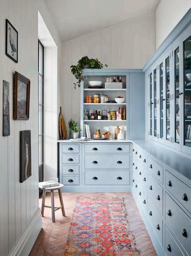 Storage has remained essential to all iterations of the kitchen across the centuries. The domestic quarters of an historic country house had clear working zones, each with its own specific purpose: the kitchen was for prep and cooking, the pantry for storing non-perishables, a cool larder for perishables, and the scullery for washing. This property had a potentially awkward, corridorlike space just off the main kitchen area which our design team decided to transform into a ‘pantry wall’ with floor-to-ceiling Chichester cabinetry combining open shelving with closed cupboards and drawers. ‘With so much storage here, the main part of the kitchen didn’t need wall cabinets, keeping it light and airy,’ says Jessica. This is unusual today, as we tend to eek out every inch of wall space, but it was a common feature of a typical Georgian kitchen, where the main kitchen was for cooking (and staff meals) only. Today, it makes room
