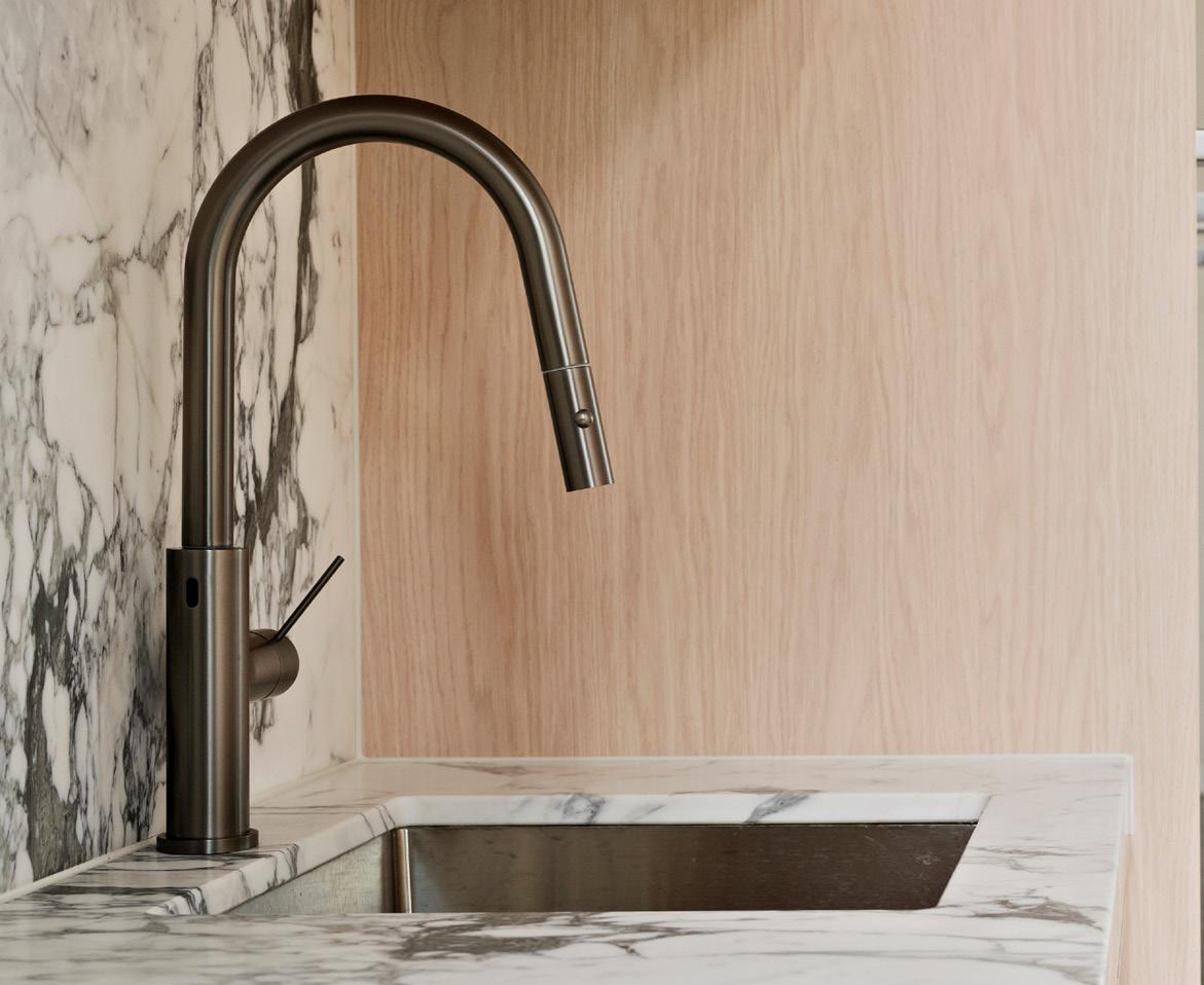 Featuring a minimalist streamlined design, the tap offers a comfortable feel and modern look that balances functionality with aesthetics. Available in up to seven finishes, it easily complements various interior styles, whether a contemporary kitchen, elegant apartment, or high-end project.