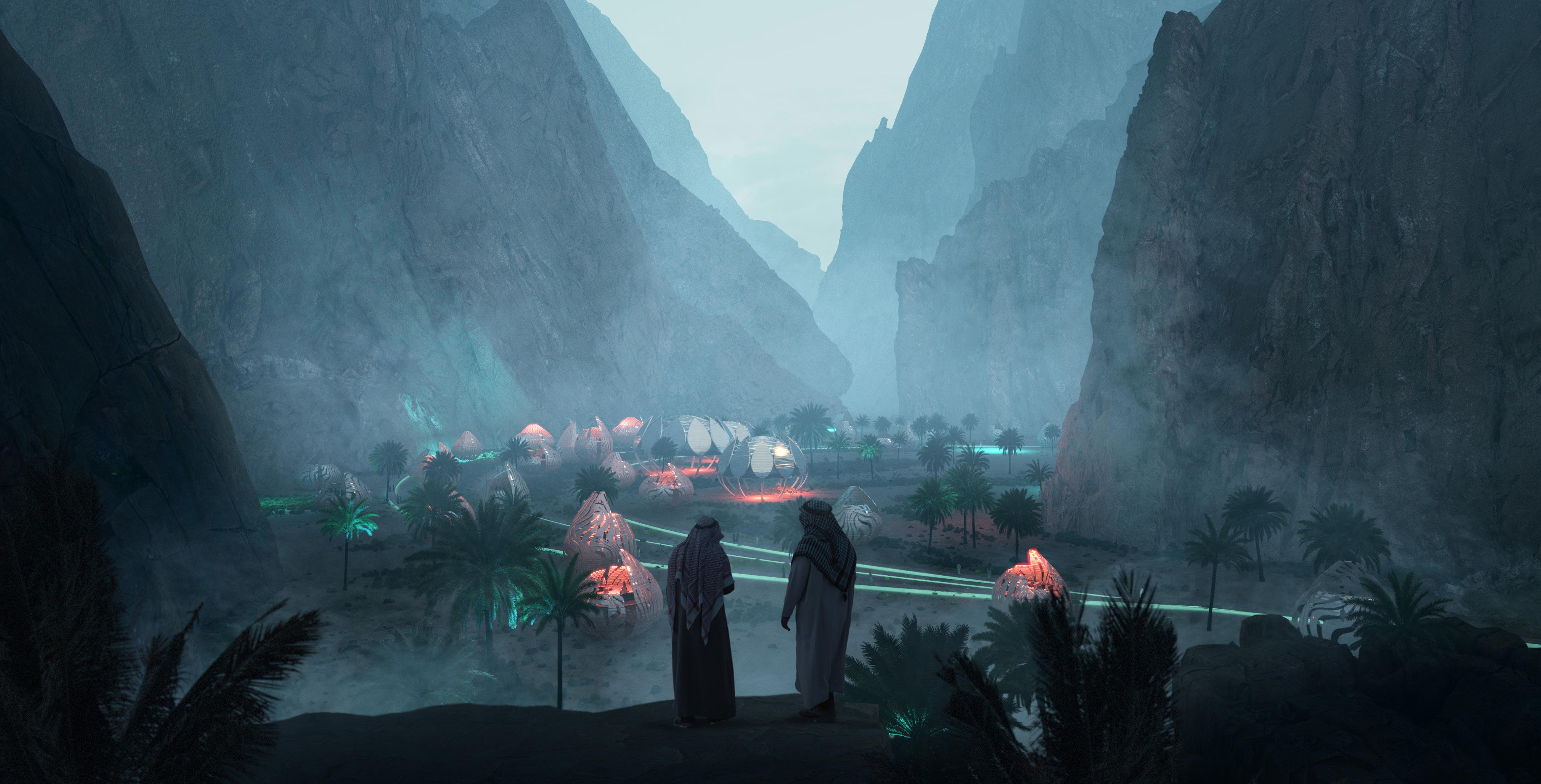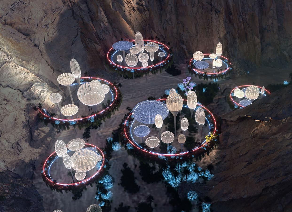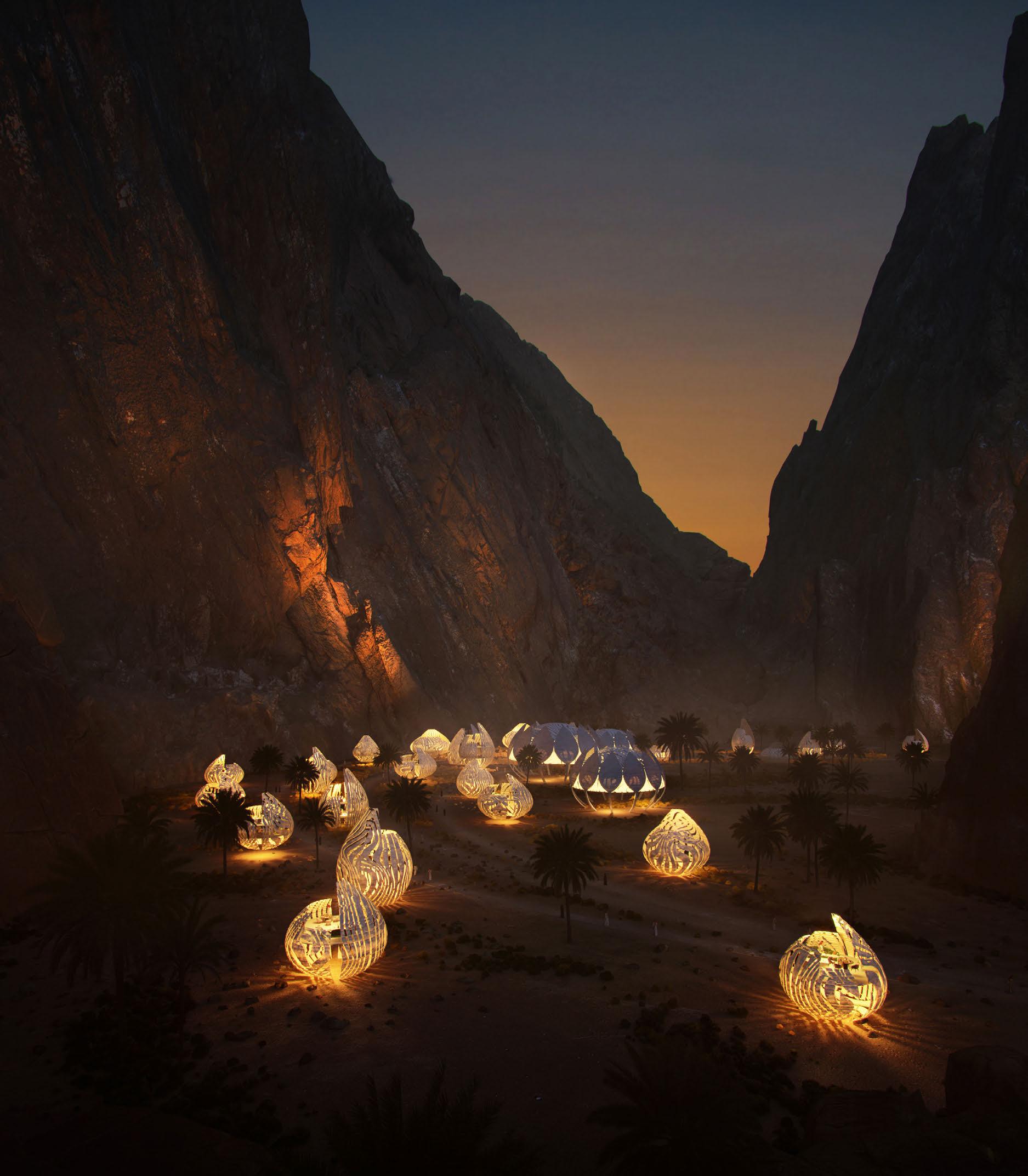 A Series of glowing pods leaning from the edge of the wadi, and illuminating the journey through valley