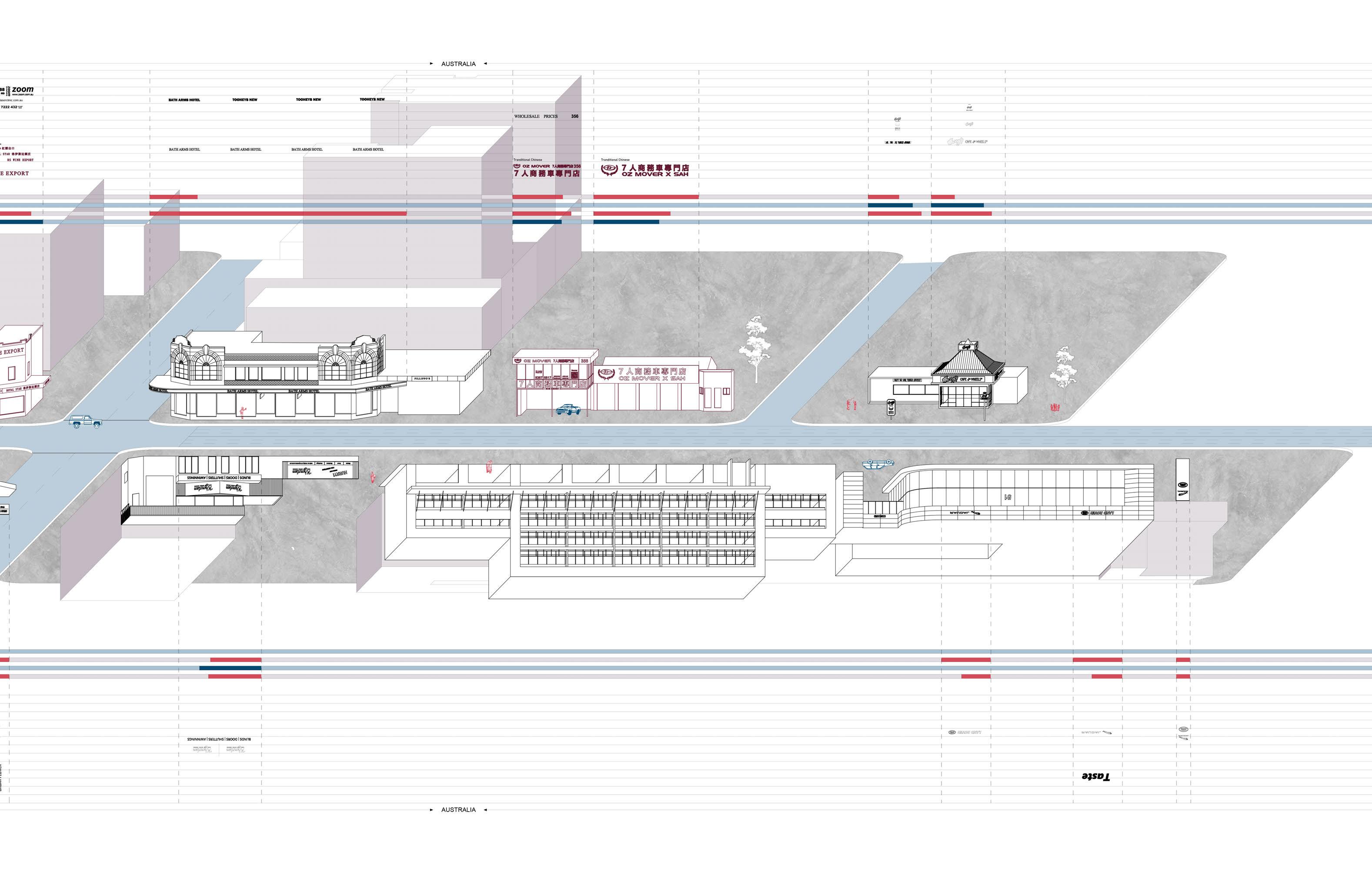 In 1799 Captain, Thomas Rowley was given a piece of land in present-day Burwood, Sydney, Australia. The rise of Parramatta Road led to the development of Burwood with amount of Australian heritage buildings of Victorian and Federation styles. Now, Burwood is popular with the Chinese community with shops and restaurants with 34.6% Chinese residents. The rapid change in demographic structure is directly reflected on signage. It is like a scattered fragment of a forcibly implanted Chinatown, but English text is relatively large in scale, mixing with Las Vegas style which is specially designed for passing cars in scale with unmindful designed typeface. The skin of heritage building is made ugly by randomly designed billboards., views of streetscapes and landscapes is covered and flooded by shop signs. It is transgressive emplacement, the old architecture is “dead”.