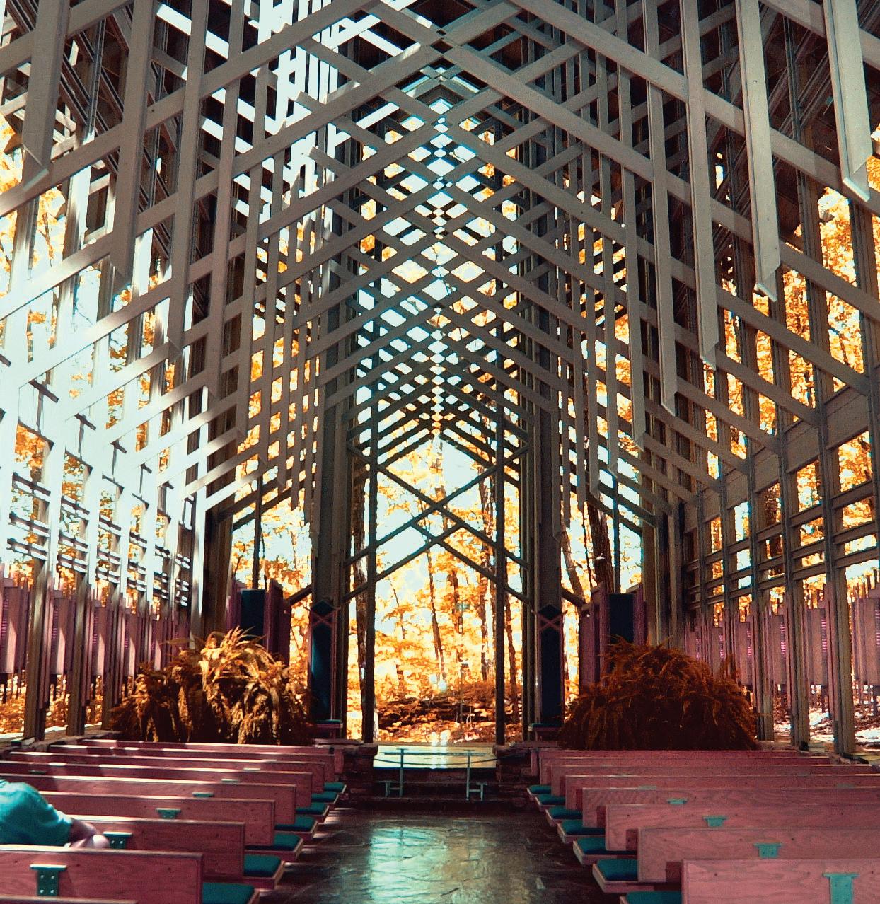 Thorncrown Chapel is an architectural masterpiece made of glass and wood that looks out upon the endless rolling, wooded hills of the Ozark Mountains. This majestic edifice was designed by renowned architect E. Fay Jones to blend perfectly with its forested setting, and since opening in 1980, has won numerous awards from the American Institute of Architects.