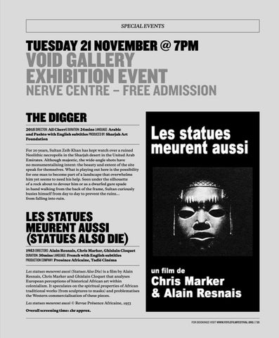 LES STATUES MEURENT AUSSI (STATUES ALSO DIE) 1953 DIRECTORS: Alain Resnais, Chris Marker, Ghislain Cloquet DURATION: 30mins LANGUAGE: French with English subtitles PRODUCTION COMPANY: Presénce Africaine, Tadié Cinéma Les statues meurent aussi (Statues Also Die) is a film by Alain Resnais, Chris Marker and Ghislain Cloquet that analyses European perceptions of historical African art within colonialism. It speculates on the spiritual properties of African traditional works (from sculptures to masks) and problematises the Western commercialisation of these pieces. Les statues meurent aussi © Revue Présence Africaine, 1953 Overall screening time: 1hr approx. FOR BOOKINGS VISIT WWW.FOYLEFILMFESTIVAL.ORG // 59