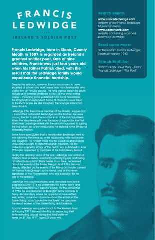 Search online: www.francisledwidge.com website of the Francis Ledwidge Museum in Slane www.poemhunter.com website containing recorded poems of Ledwidge