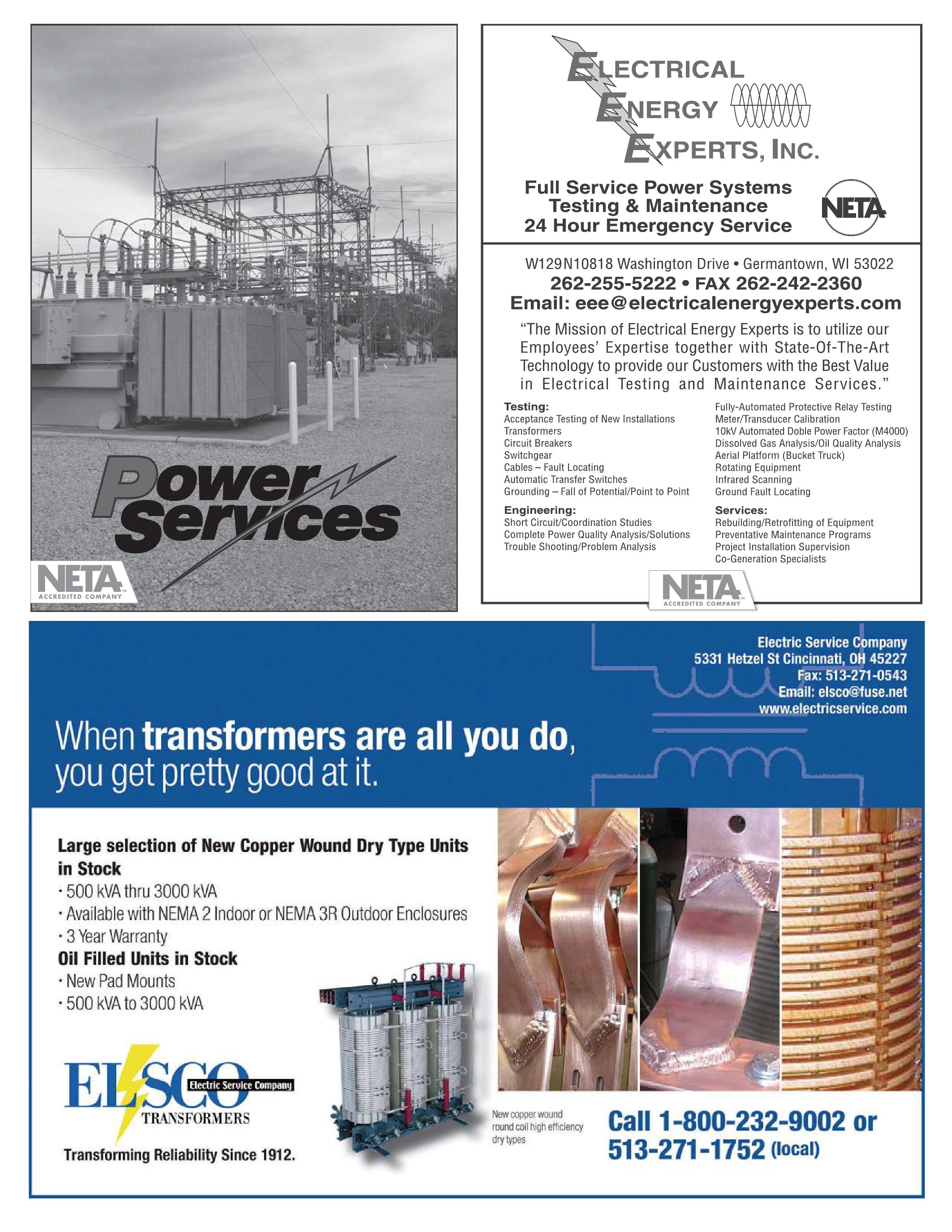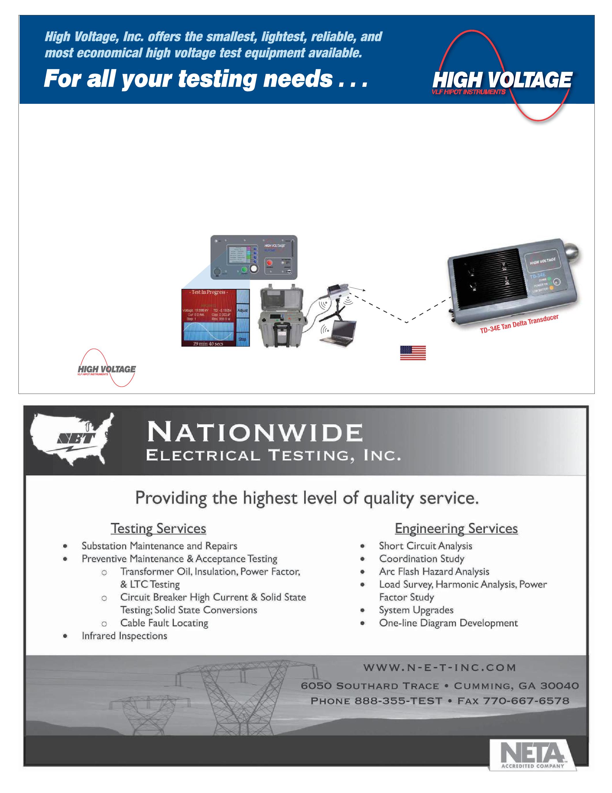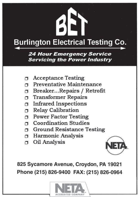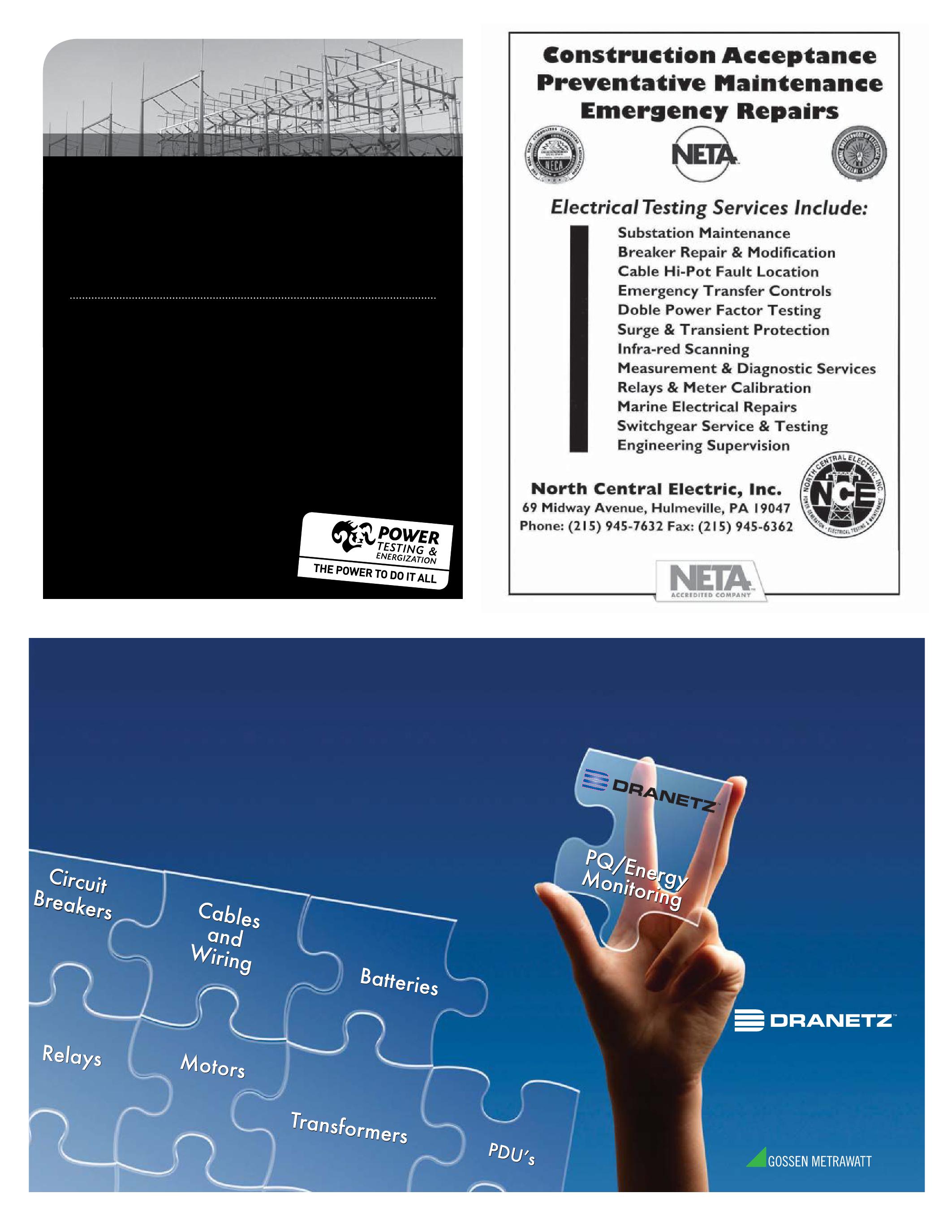 World. INDEPENDENT NETA ACCREDITED COMPANIES American Electrical Testing Co., Inc. ................. 9 Apparatus Testing and Engineering 48 Burlington Electrical Testing Co., Inc. ...............77 Eastern High Voltage...............................98 Electrical Energy Experts, Inc........................52 Electrical Reliability Services .......................105 Elemco Services, Inc. ...............................84 EnerG Test ........................................59 Harford Electrical Testing Co., Inc. .................115 High Voltage Maintenance Corp. ..................122 Industrial Electrical Testing, Inc. ....................75 Infra-Red Building and Power Service ................6 Nationwide Electrical Testing, Inc ..................122 North Central Electric, Inc. .........................35 ..............104 Potomac Testing, Inc. ..............................29 Power & Generation Testing, Inc. ...................59 Power Products & Solutions, Inc. ....................19 Power Services, LLC ...............................52 Power Systems Testing Co. ..........................42 ..............35 PRIT Service, Inc. .................................83 Scott Testing, Inc. ..................................77 Shermco Industries. ................................82 Sigma Six Solutions .................................6 Taurus Power & Controls, Inc. .....................115 Three-C Electrical Co. Inc. .........................98 Tony Demaria Electric, Inc. .........................74 Trace Electrical Services & Testing, LLC .............75 Utility Service Corporation .........................9 MANUFACTURERS AND OTHER SERVICE PROVIDERS Advance Test Equipment Rentals (ATE Corp) ...............83 Aero Tec Laboratories ...................................... 48 Ampteks .................................................. 43 Arbiter Systems, Inc. ...................................... 115 .................................. 10 Avox Technologies .......................... Inside Back Cover BCS Switchgear, Inc. ...................................... 103 Belyea Company, Inc. ...................................... 19 Burlington Safety Laboratory, Inc. ...........................84 CBS ArcSafe ............................................... 8 CBS ArcSafe - Circuit Breaker Analyzer. ..................... 43 CBS Vacuum Interrupters, Inc. . ............................. 24 DV Power ................................................. 49 Doble ..................................................... 18 Dranetz ................................................... 35 Electric Service Co. ..................................... 52, 84 ElectroRent ........................................... 77, 105 Group CBS, Inc. .......................................... 106 High Voltage, Inc........................................... 48 HV Diagnostics, Inc. ....................................... 42 Intellirent ................................................. 34 IEEE/ESW. .............................................. 129 IRISS .....................................................28 KoCos America, LLC ...................................... 66 Megger ....................................Inside Front Cover Monster Fuses ............................................ 104 National Switchgear ........................................ 96 NETA Alliance Program ................................... 74 NETA ATS .............................................. 123 NETA Mobile App ....................................... 121 NETA PowerTest Call for Exhibitors ........................79 NETA PowerTest Call for Sponsors. ......................... 97 NETA PowerTest Register Now .............................15 NETA SPTS ............................................. 117 NETA/ANSI Standards .................................... 25 NETA Training ............................................ 95 NETA Why Hire NAC? ................................... 78 .................Back Cover Phenix Technologies, Inc. .................................. 104 Protec Equipment Resources .................................5 Quality Switchgear, Inc. ..................................... 8 Raytech ...................................................53 Solid State Exchange & Repair Co........................... 67 Technitrol, Inc. ............................................89 Thyritronics, Inc............................................89 Utility Relay Company .....................................14 Utility Products Conference & Expo . ...................... 118 Vanguard Instrument Co., Inc. .............................. 17