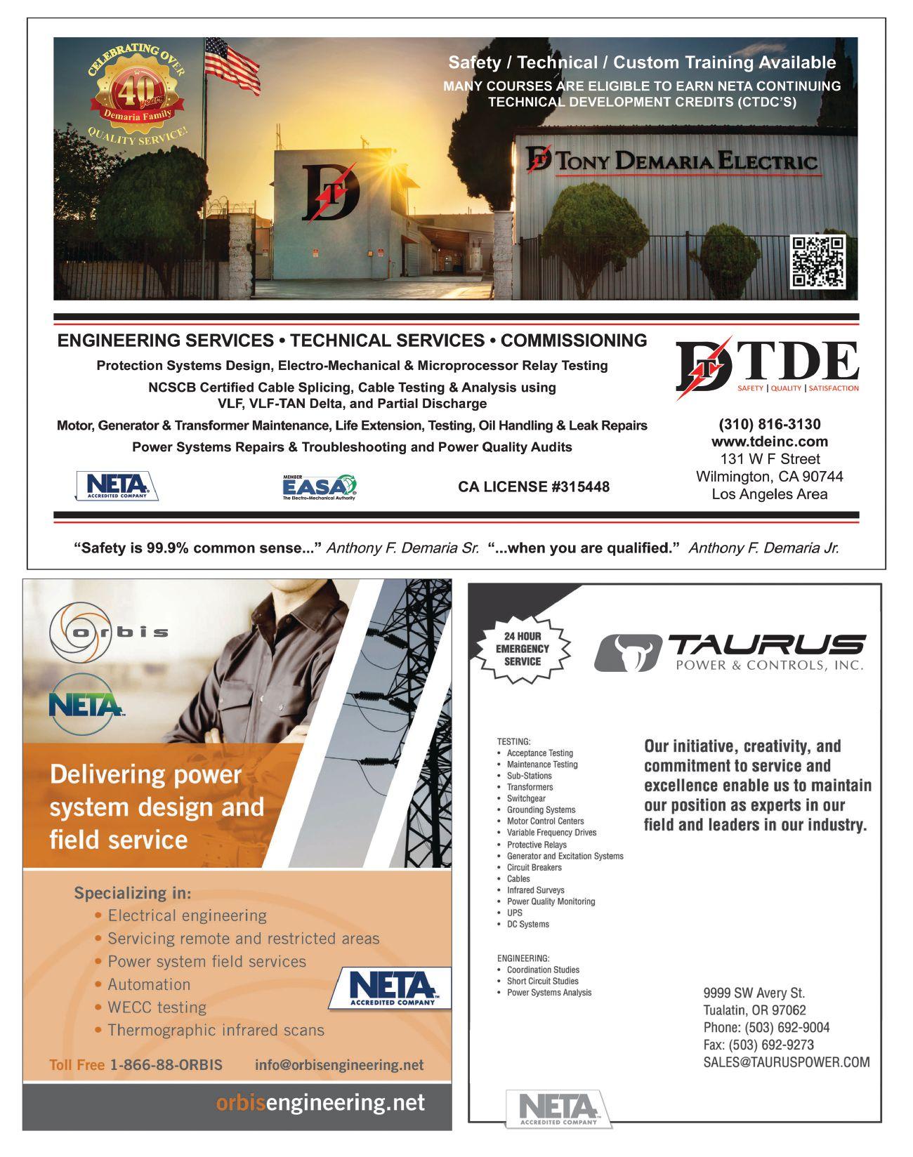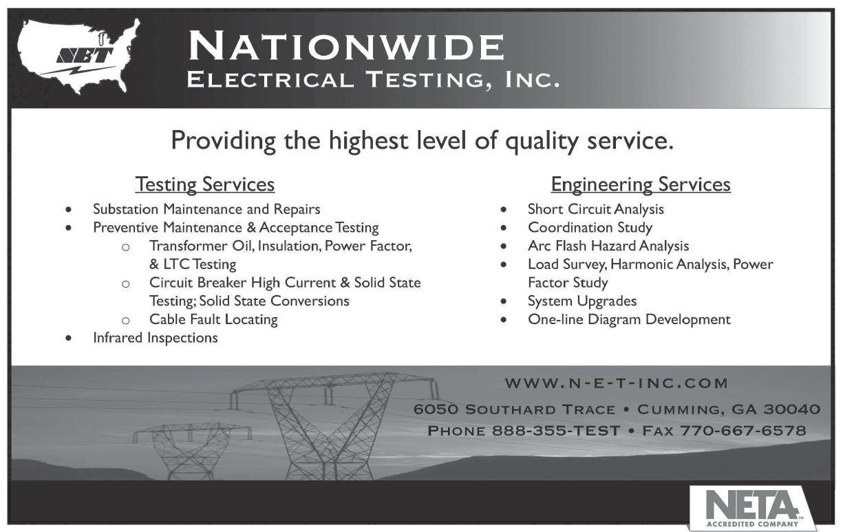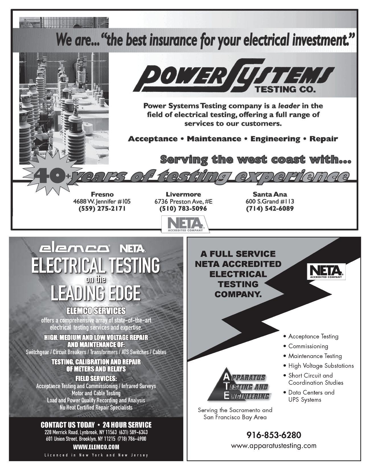 their advertisement in NETA World Journal. INDEPENDENT NETA ACCREDITED COMPANIES Absolute Testing Services, Inc. 107 American Electrical Testing Co. LLC 21 Apparatus Testing and Engineering 111 Burlington Electrical Testing Co. ..................... 6 CE Power ........................................ 121 Eastern High Voltage............................... 12 Electrical Energy Experts, Inc. 44 Electrical Reliability Services (Vertiv) 89 Elemco Testing Co., Inc. 111 EnerG Test ........................................ 61 Hampton Tedder .................................. 92 Harford Electrical Testing Co. ...................... 61 High Voltage Maintenance Corp. 89 Industrial Electric Testing, Inc. 77 Infra-Red Building and Power Service, Inc. 44 National Field Services 79 Nationwide Electrical Testing, Inc. ................. 113 North Central Electric, Inc. ......................... 88 Orbis Engineering Field Services LTD ............... 46 Potomac Testing, Inc. 62 Power Products & Solutions, Inc. 103 Power Services 6 Power Systems Testing Co. 111 Power Testing and Energization, Inc. ............... 120 Scott Testing Inc. ................................. 120 Shermco Industries.................................. 9 Sigma Six Solutions, Inc. 113 Taurus Power & Controls, Inc. 46 Tony Demaria Electric, Inc. 46 Trace Electrical Services & Testing ................... 32 MANUFACTURERS AND OTHER SERVICE PROVIDERS Advanced Test Equipment Rentals (ATE Corp) .............. 68 AEAMC .................................................. 93 AEMC ................................................... 32 Aero Tech Laboratories 108 Ampteks 69 Arbiter Systems 79 AVO Training Institute, Inc. 63 B CS Switchgear ........................................... 19 Belyea Company ........................................... 45 Bullock Breakers 106 Burlington Safety Laboratory, Inc. 110 CBS ArcSafe 90 Dranetz 45 E A Technology ............................................ 53 ECP Solutions ............................................. 33 Electro Rent ............................................... 85 Group CBS, Inc. 93 High Voltage Inc. 120 High Voltage Electric Service, Inc. 108 Hioki USA 8 HV Diagnostics, Inc. ...................................... 108 Intellirent ................................................. 84 Megger .................................... Inside Front Cover Monster Fuses 88 National Switchgear 47 NETA ANSI/NETA ETT. . . . . . . . . . . . . . . . . . . . . . . . . . . . . . . . . 104 NETA Hire a NAC ........................................ 31 NETA PowerTest 2019 Call for Exhibitors ................... 78 NETA PowerTest 2019 Call for Sponsors .................... 13 NETA PowerTest 2019 Save the Date 55 NETA Training 47 OMICRON Electronics Corp. USA Back Cover Phenix Technologies, Inc. 103 Protec Equipment Resources ............................... 102 Quality Switchgear, Inc. .................................... 69 R aytech ..................................... Inside Back Cover Solid State Exchange 5 Sonel Test 54 Southland Electrical Supply 26 Technitrol, Inc. 18 Thyritronics, Inc............................................ 88 Utility Relay Company ..................................... 27 Vacuum Interrupters, Inc. 90