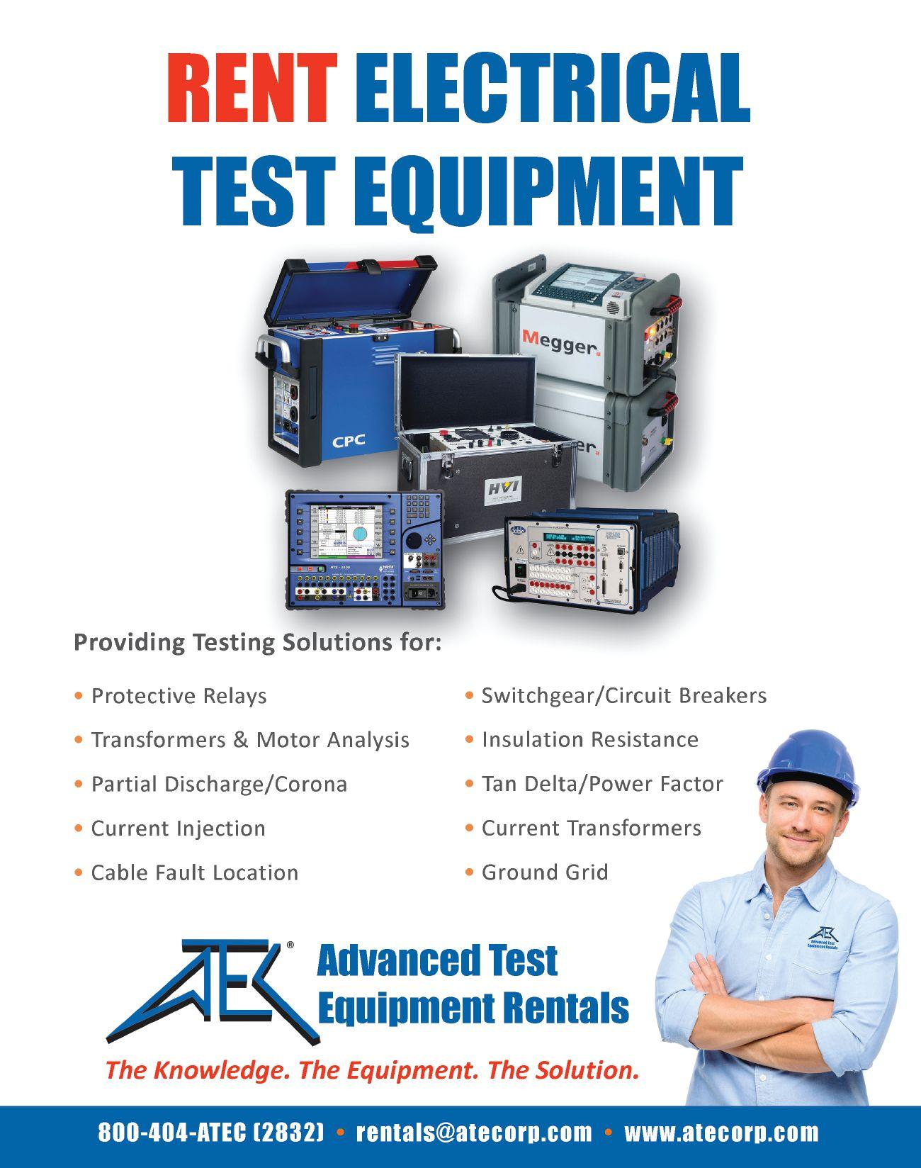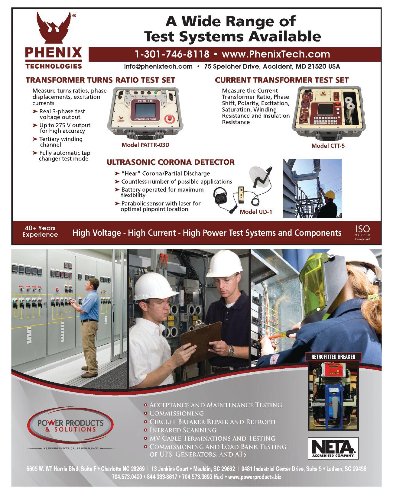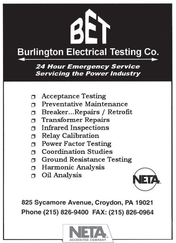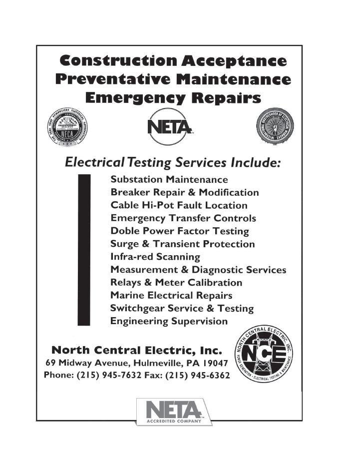 their advertisement in NETA World Journal. INDEPENDENT NETA ACCREDITED COMPANIES Absolute Testing Services, Inc. 107 American Electrical Testing Co. LLC 21 Apparatus Testing and Engineering 111 Burlington Electrical Testing Co. ..................... 6 CE Power ........................................ 121 Eastern High Voltage............................... 12 Electrical Energy Experts, Inc. 44 Electrical Reliability Services (Vertiv) 89 Elemco Testing Co., Inc. 111 EnerG Test ........................................ 61 Hampton Tedder .................................. 92 Harford Electrical Testing Co. ...................... 61 High Voltage Maintenance Corp. 89 Industrial Electric Testing, Inc. 77 Infra-Red Building and Power Service, Inc. 44 National Field Services 79 Nationwide Electrical Testing, Inc. ................. 113 North Central Electric, Inc. ......................... 88 Orbis Engineering Field Services LTD ............... 46 Potomac Testing, Inc. 62 Power Products & Solutions, Inc. 103 Power Services 6 Power Systems Testing Co. 111 Power Testing and Energization, Inc. ............... 120 Scott Testing Inc. ................................. 120 Shermco Industries.................................. 9 Sigma Six Solutions, Inc. 113 Taurus Power & Controls, Inc. 46 Tony Demaria Electric, Inc. 46 Trace Electrical Services & Testing ................... 32 MANUFACTURERS AND OTHER SERVICE PROVIDERS Advanced Test Equipment Rentals (ATE Corp) .............. 68 AEAMC .................................................. 93 AEMC ................................................... 32 Aero Tech Laboratories 108 Ampteks 69 Arbiter Systems 79 AVO Training Institute, Inc. 63 B CS Switchgear ........................................... 19 Belyea Company ........................................... 45 Bullock Breakers 106 Burlington Safety Laboratory, Inc. 110 CBS ArcSafe 90 Dranetz 45 E A Technology ............................................ 53 ECP Solutions ............................................. 33 Electro Rent ............................................... 85 Group CBS, Inc. 93 High Voltage Inc. 120 High Voltage Electric Service, Inc. 108 Hioki USA 8 HV Diagnostics, Inc. ...................................... 108 Intellirent ................................................. 84 Megger .................................... Inside Front Cover Monster Fuses 88 National Switchgear 47 NETA ANSI/NETA ETT. . . . . . . . . . . . . . . . . . . . . . . . . . . . . . . . . 104 NETA Hire a NAC ........................................ 31 NETA PowerTest 2019 Call for Exhibitors ................... 78 NETA PowerTest 2019 Call for Sponsors .................... 13 NETA PowerTest 2019 Save the Date 55 NETA Training 47 OMICRON Electronics Corp. USA Back Cover Phenix Technologies, Inc. 103 Protec Equipment Resources ............................... 102 Quality Switchgear, Inc. .................................... 69 R aytech ..................................... Inside Back Cover Solid State Exchange 5 Sonel Test 54 Southland Electrical Supply 26 Technitrol, Inc. 18 Thyritronics, Inc............................................ 88 Utility Relay Company ..................................... 27 Vacuum Interrupters, Inc. 90