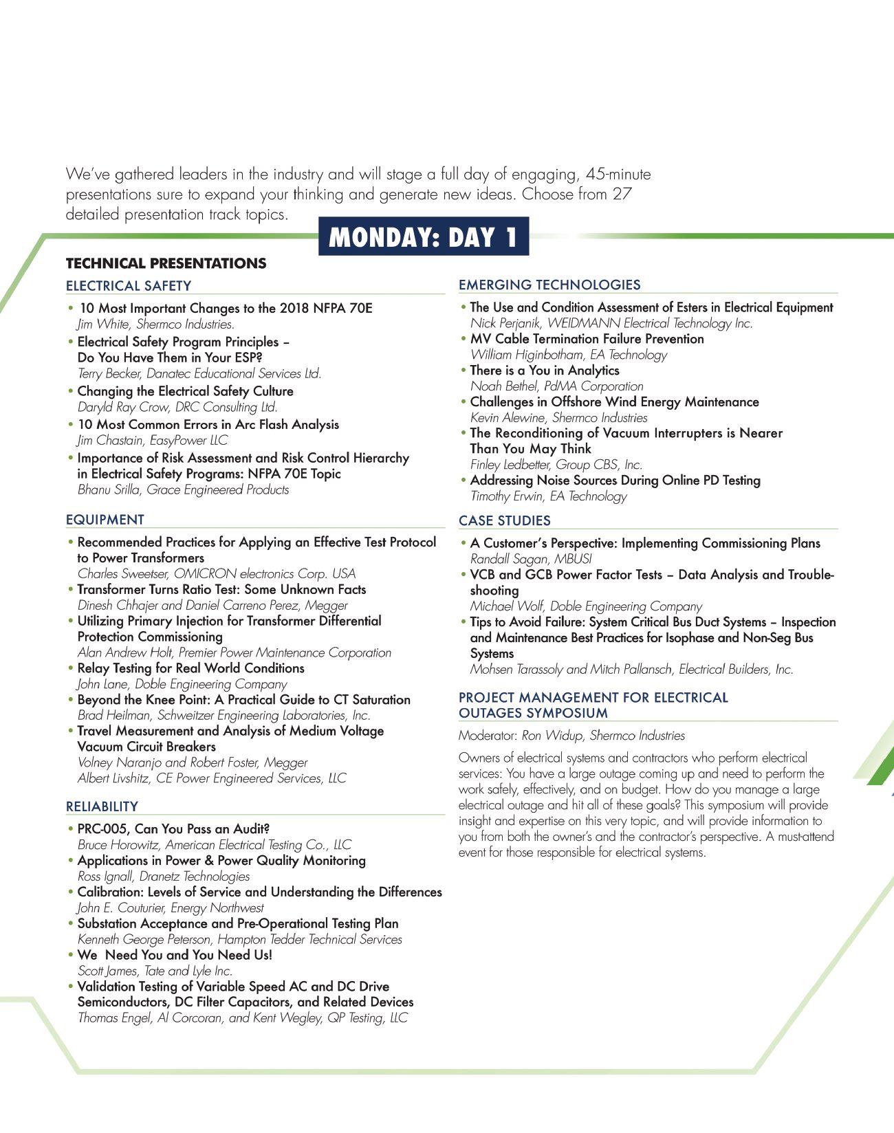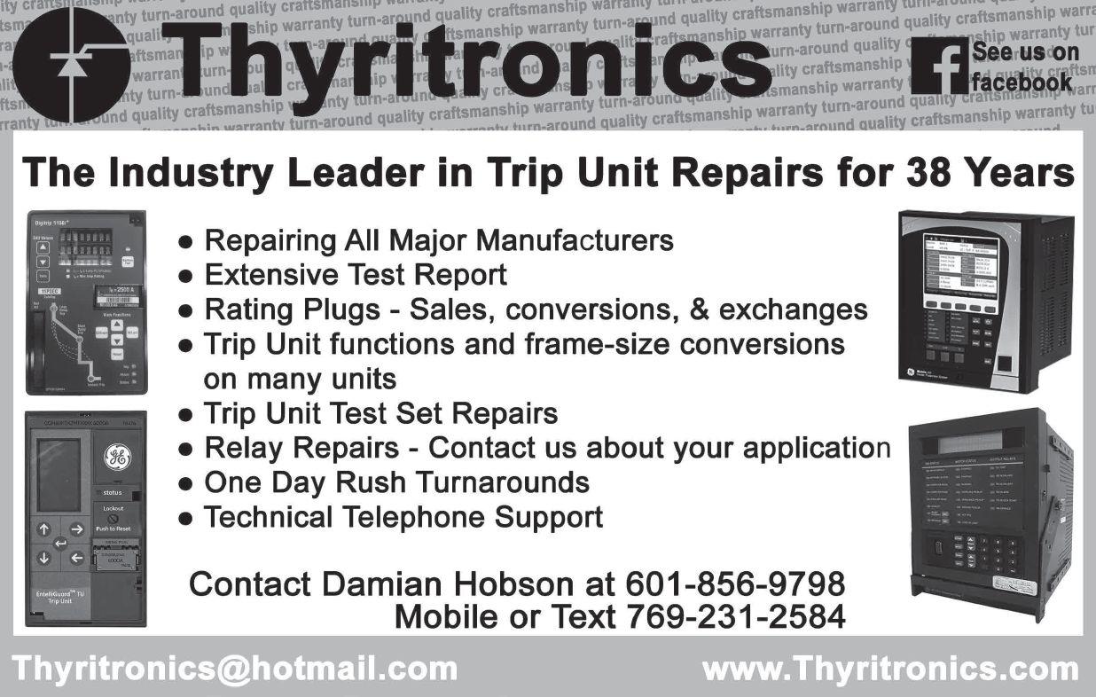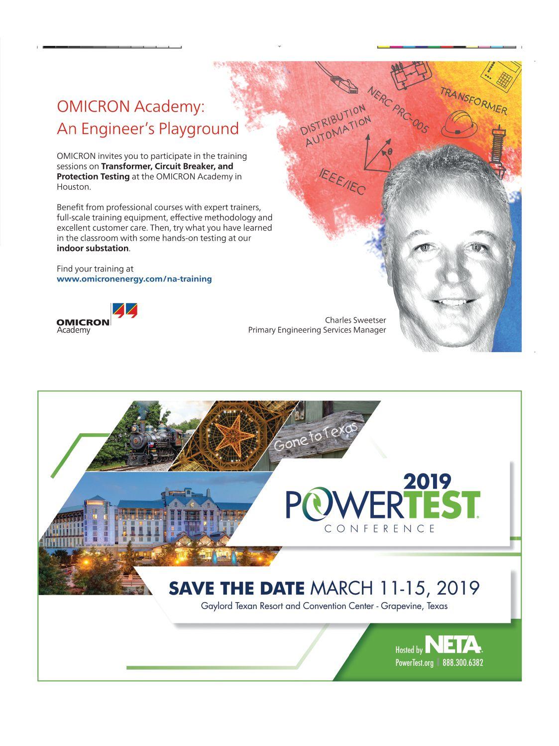 • Circuit Breaker Seminar: October 1-5, 2018 | Jackson, MS • Life of a Transformer Seminar: February 11-15, 2019 | Summerlin, NV • Rotating Machinery & Electrical Plant Reliability Tutorial: April 10-11, 2019 | Boston, MA • Laboratory Seminars: offered throughout the year • Protection Training Courses: various topics offered throughout the year • Free Webinars: 30+ topics throughout the year covering testing, safety and more TRAINING OPPORTUNITIES www.doble.com/training Learn from the industry’s top experts, receive real-world training you can immediately apply, and build your professional network with various educational programs offered throughout the year. Make training a priority for you & your team LEARN MORE take the best hands-on electrical training back to the field with you. www.avotraining.com Over 57 courses including: