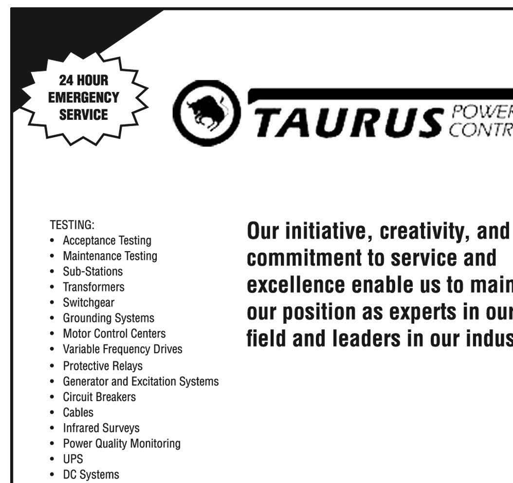 Taurus Power & Controls, Inc. 8714 South 222nd St. STE A Kent, WA 98031 (425) 656-4170 powertest@tauruspower.com www.taruspower.com