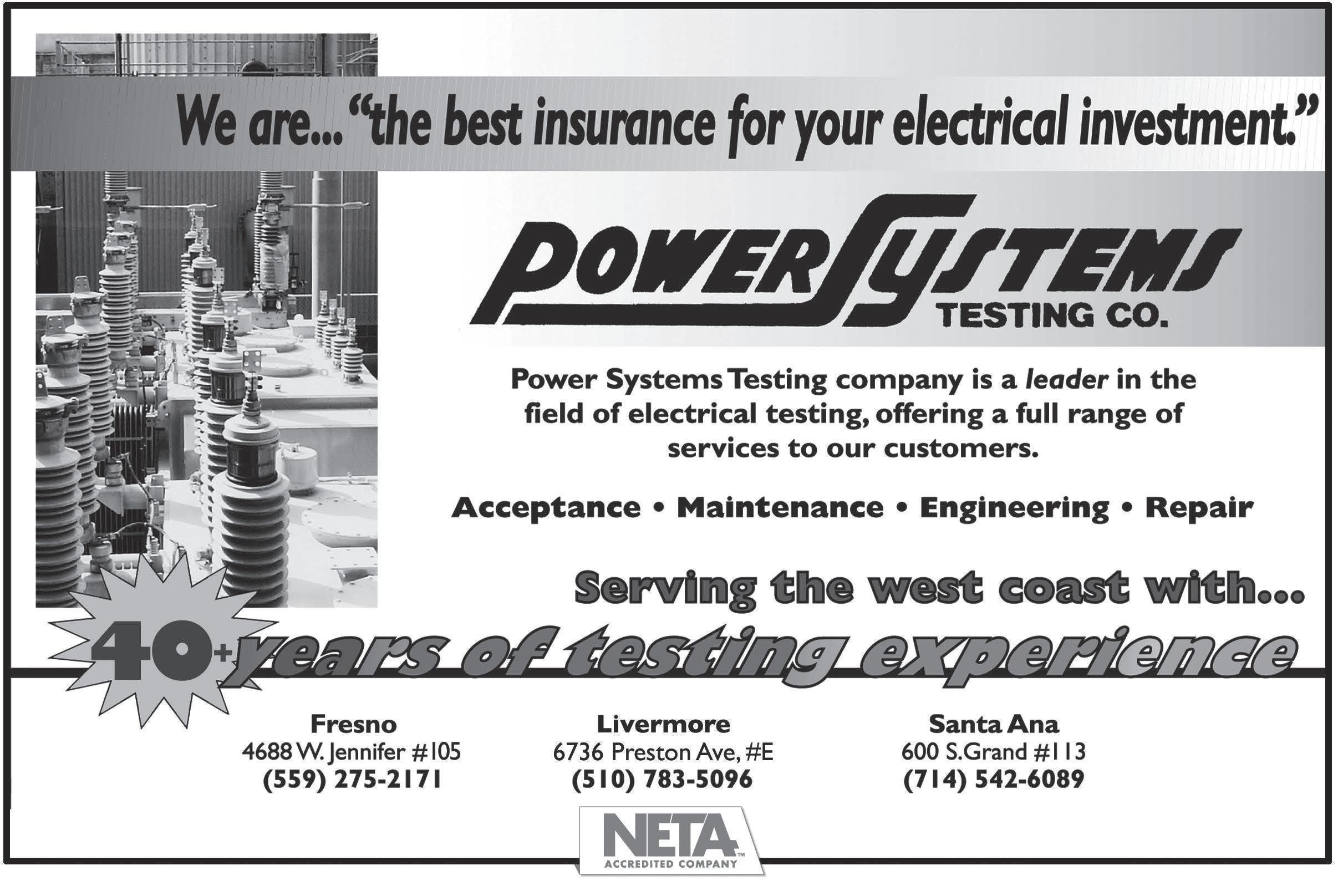 •Acceptance Testing •Preventative and Predictive Maintenance •Technical Support•Protective Relays • Transformers• Switchgear • Breakers • Infrared & Ultrasonic Survey • Cable Locating • VLF & Tan Delta Testing• Partial Discharge• Meters• Grounding• Generator Controls• ATS• UPS• Battery Systems • Motor Control Centers • Switches• Capacitor Banks