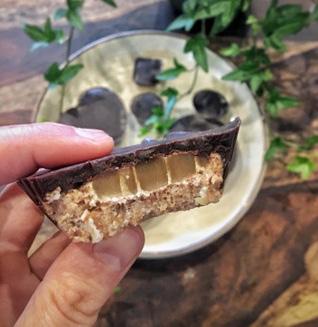 Bræðið kakósmjörið, bætið hinum hráefnunum saman við og hrærið þar til blandan verður silkimjúk. Hellið ofan á karamelluna. Bitarnir eru tilbúnir þegar súkkulaðið hefur harðnað. Instagram: instagram.com/tinna_sif