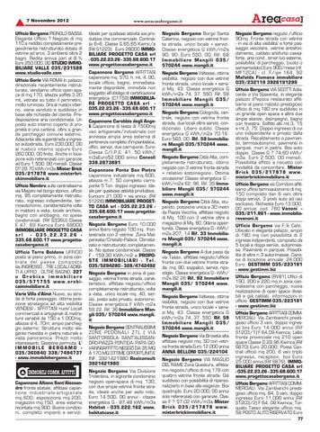 7 Novembre 2012 Ufficio Bergamo PIGNOLO BASSA Elegante Ufficio ? Negozio di mq 110 a reddito completamente pregevolmente ristrutturato dotato di vetrine ad arco, 3 ambienti oltre 2 bagni. Redita annua pari al 8 % Euro 250.000, 00 STUDIO IMMOBILIARE VALLE 035/231588 www.studio-valle.com Ufficio Gorle VIA ROMA In palazzo direzionale recentemente ristrutturato, vendiamo ufficio open space di mq.170, altezza soffitti 3.20 mt, vetrate su tutto il perimetro, molto luminoso. Ora al rustico interno, viene venduto e suddiviso in base alle richieste del cliente. Predisposizione aria condizionata. Un posto auto interno coperto di proprietà e una cantina, oltre a grande parcheggio comune esterno. Adiacente alla superstrada e ingresso autostrada. Euro 230.000, 00 al rustico interno oppure Euro 260.000, 00 finito. Anche in locazione solo referenziati con garanzie ad Euro 1.500, 00 mensili. Classe D? 29.70 kWh/m3a Mister Brick 035/217878 www.misterbrickimmobiliare.it Ufficio Nembro sulla centralissima via Mazzini nel borgo storico, ufficio mq. 85 completamente ristrutturato, ingresso indipendente, termoautonomo, caratteristiche volte in mattoni a vista, locale archivio, bagno con antibagno, no spese condominiali. (Rif S336U) Classe E 47, 69 Kwmca Euro 68000 IMMOBILIARE PROGETTO CASA srl - 035.22.23.26 335.68.600.17 www.progettocasabergamo.it Ufficio Torre Boldone UFFICIO posto al piano primo, in zona centrale del paese composto da:INGRESSO , TRE LOCALI ADIBITI A UFFICI , OLTRE BAGNO. 227 u Orobica immobiliare 035/571755 www.orobicaimmobiliare.it Varie Villa d'Almè Nuovo, su strada di forte passaggio, ottima posizione strategica ad alta visibilità VENDESI - AFFITTASI nuovi Locali commerciali e artigianali di metrature variabili da 150 a 1.000mq, altezza di 4, 70m, ampio parcheggio esterno. Struttura molto elegante rivestita in pietra naturale e vista panoramica. Prezzi molto interessanti, Gestione permuta. L' IMMOBILE BERGAMO 035/360840 338/7494737 - www.immobilebergamo.it