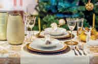 L’eleganza della tavola natalizia dipende anche dai piatti e dai bicchieri. I calici di cristallo sono un ottimo effetto scenico così come i piatti in porcellana. A fianco di quest’ultimi sono indicate le posate in argento.
