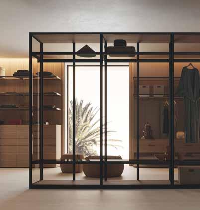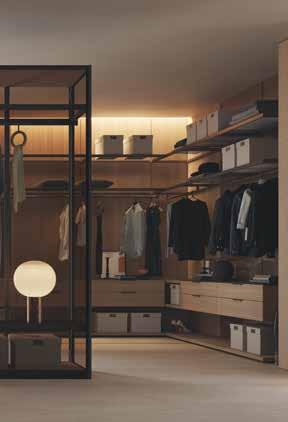 In pagina, in basso a sinistra e in alto a destra The Hill House. Al centro, la cabina armadio Ventitré e l’armadio Tian. In basso a destra il sistema L25