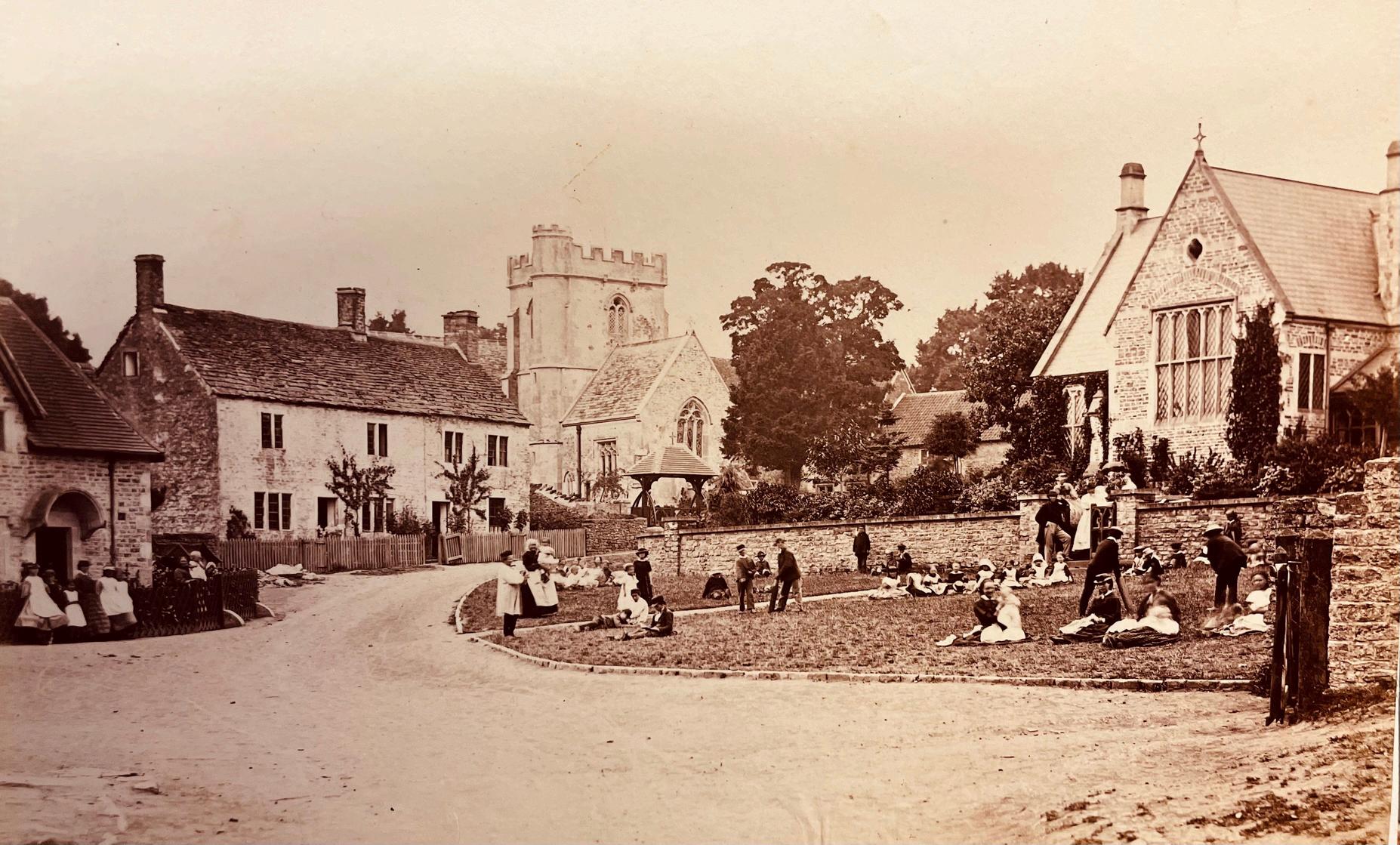Children playing a crowded game of cricket in Lullington. Circa 1890.
