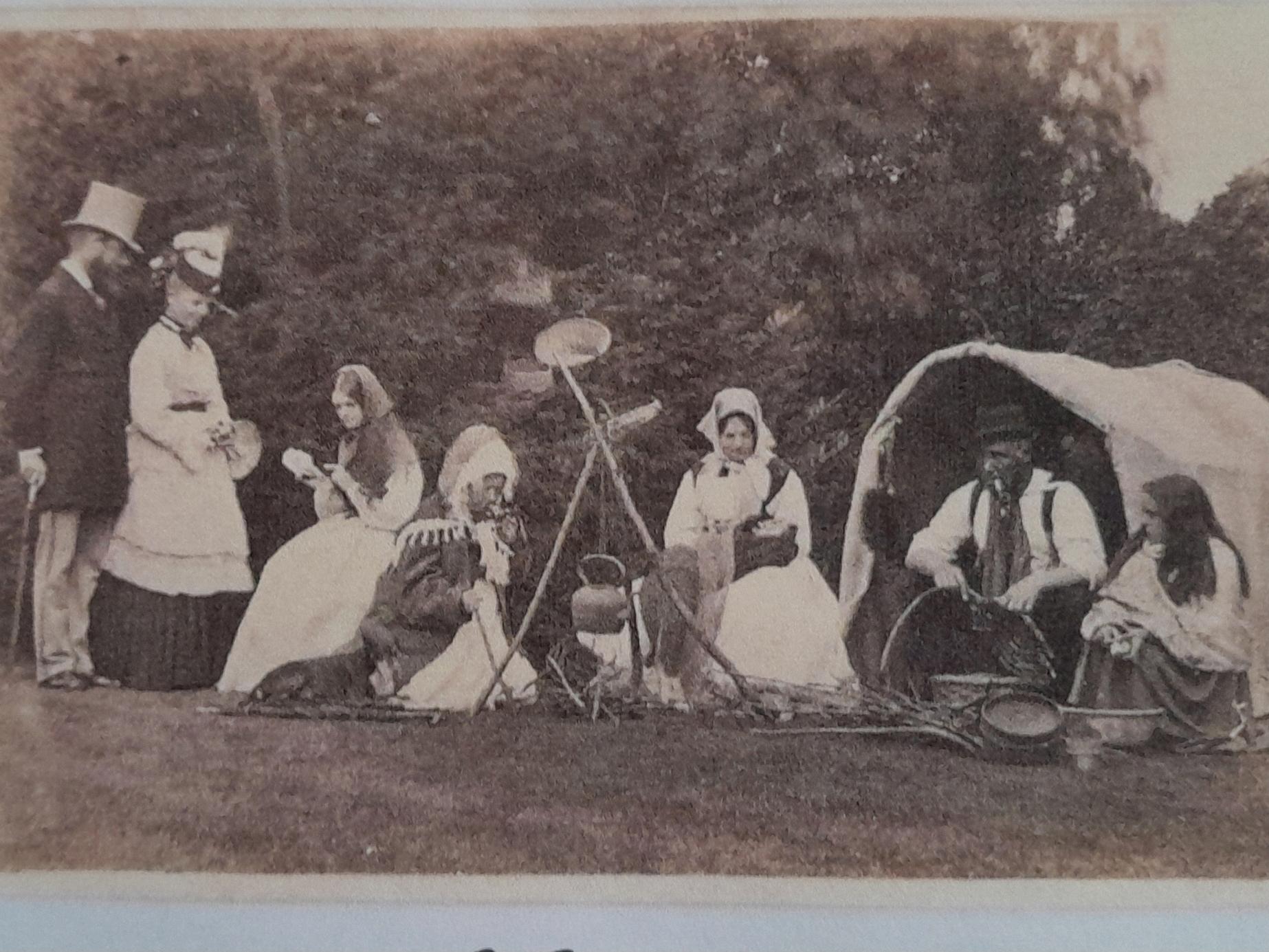 A traditionally dressed group of Romany gypsies in the area. A common sight in Southern England for many years during the summer months, as there was ample employment for all the members of the family in the fields and orchards gathering in the harvest. Photo: Rector Langford Sainsbury, 1860s