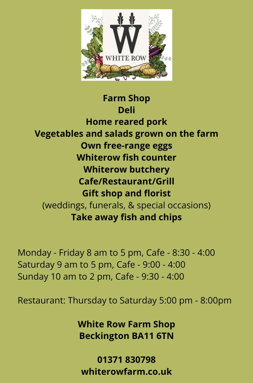 We are lucky to have two superb farm shops in this neighbourhood. I pop into White Row (Beckington) regularly, I love the bread they sell… and their fish and chips – pricey but top quality.