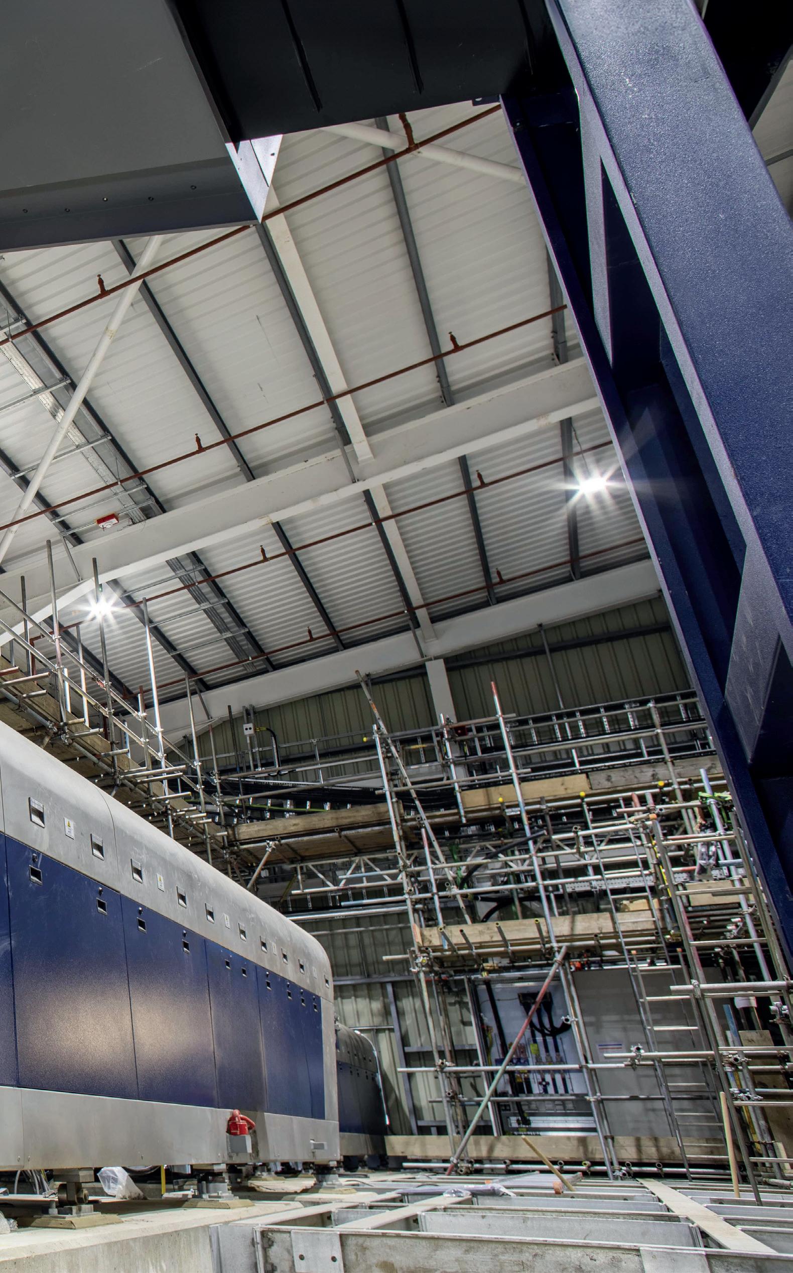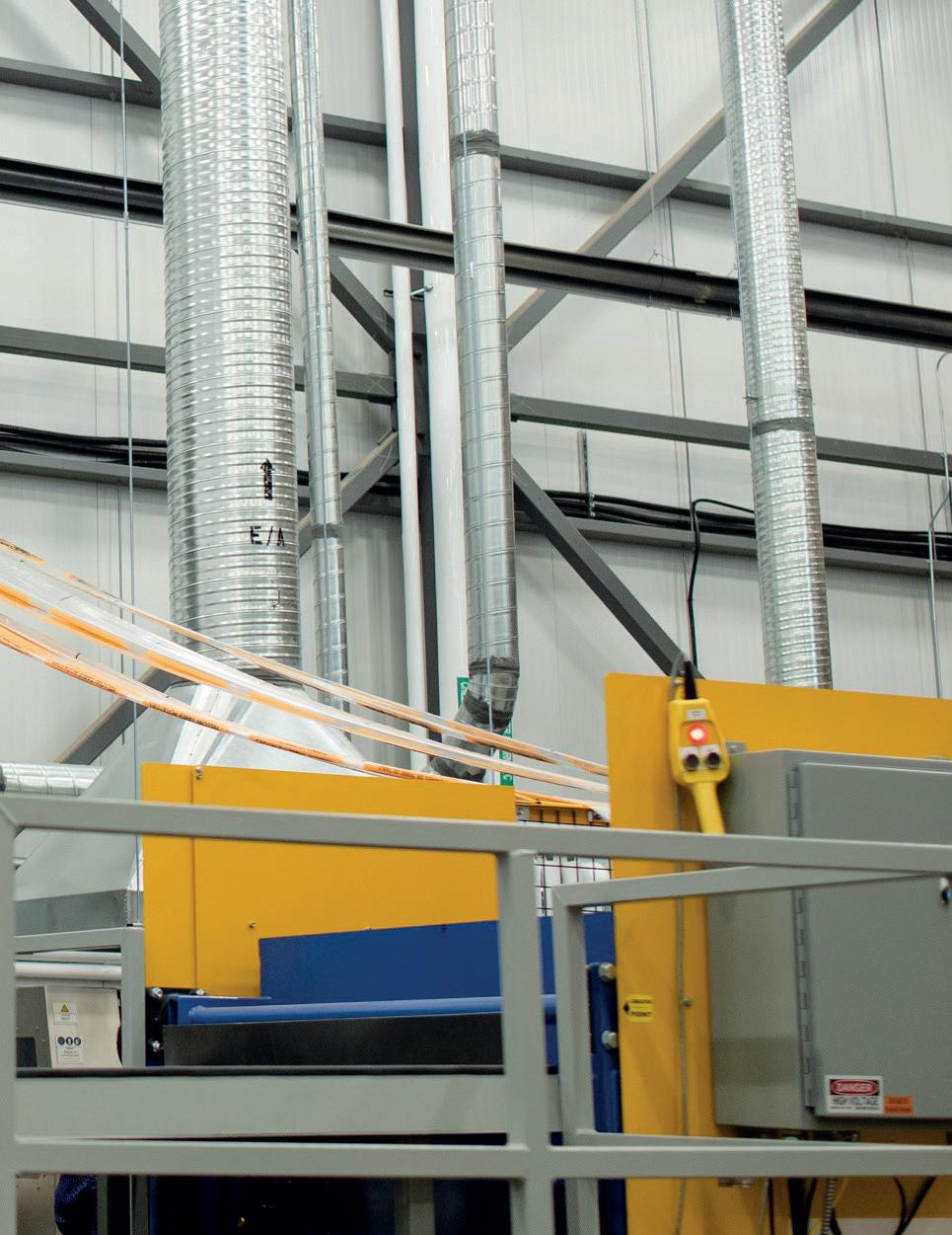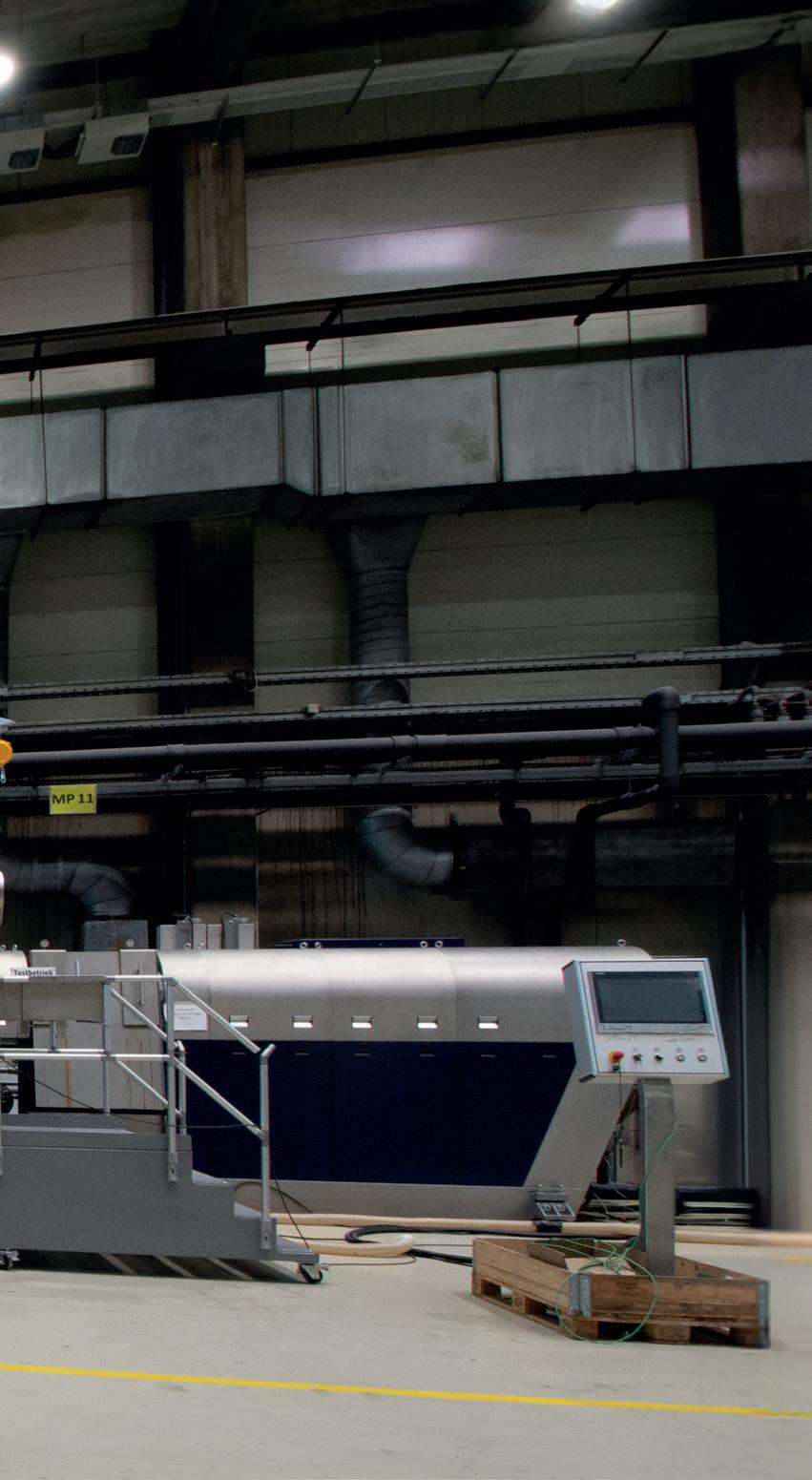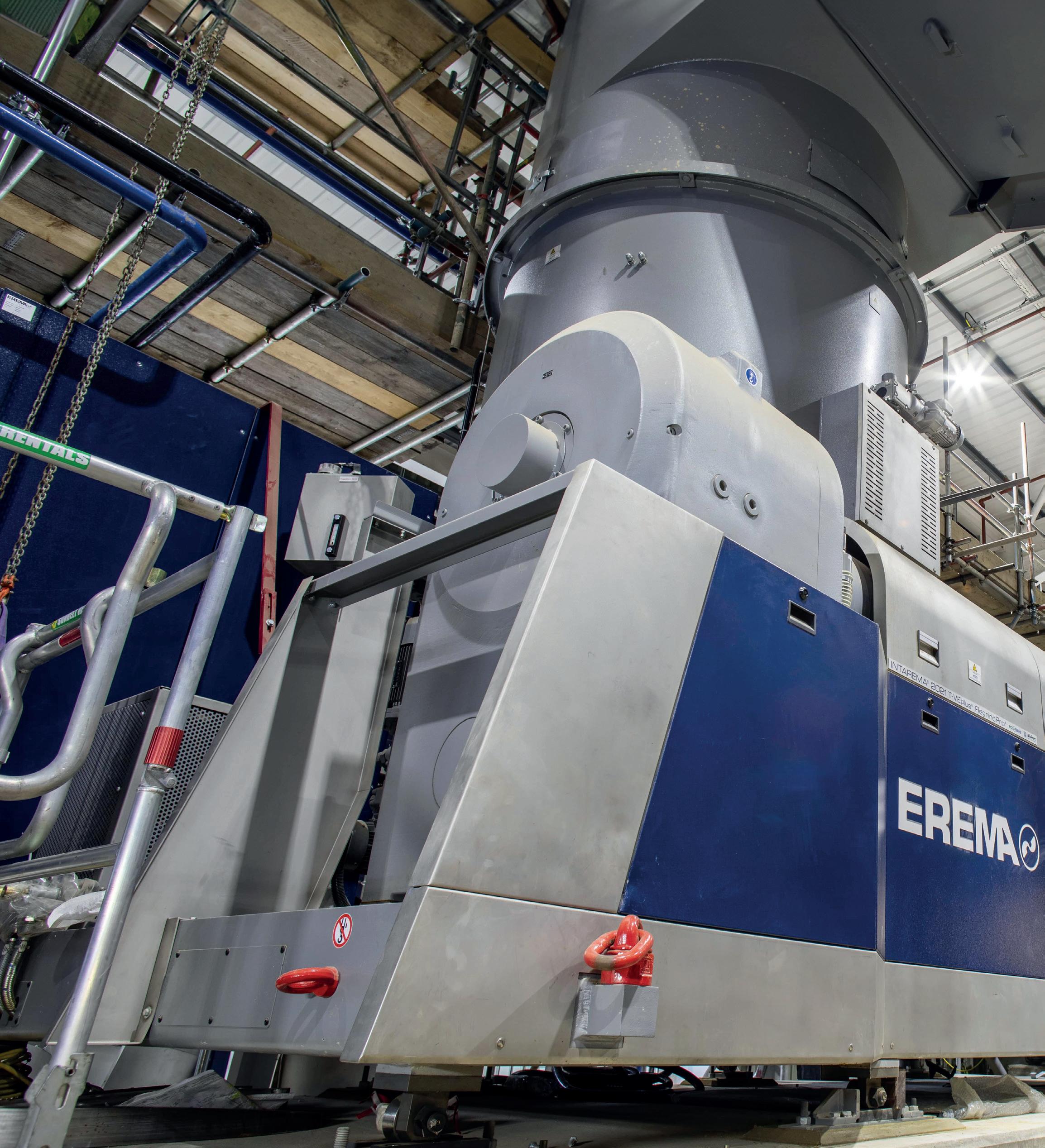 Many of the specially built, large-scale components were installed and matched together for the first time during this project, such as 690-volt motors and the largest laser filter system ever built by EREMA. The 2/406 Quattro Laser Filter has a total filter area of 7,800 square centimetres and contributes to the high stability of the plant thanks to its robust design and precision filtration. The control panel array is also something new. At 12 metres long, the electrical container is imposing, but it is compact relative to the size of the machine. The well-thoughtout configuration makes prior installation, transport and maintenance work particularly straightforward.