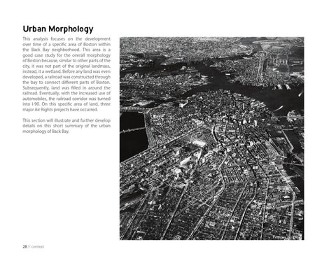 Urban Morphology This analysis focuses on the development over time of a specific area of Boston within the Back Bay neighborhood. This area is a good case study for the overall morphology of Boston because, similar to other parts of the city, it was not part of the original landmass, instead, it a wetland. Before any land was even developed, a railroad was constructed through the bay to connect different parts of Boston. Subsequently, land was filled in around the railroad. Eventually, with the increased use of automobiles, the railroad corridor was turned into I-90. On this specific area of land, three major Air Rights projects have occurred. This section will illustrate and further develop details on this short summary of the urban morphology of Back Bay.