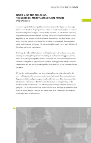 Never mind the Buildings: thoughts on an infrastructural future Ian Baldwin A century ago, E.M. Forster published a short story in the Oxford and Cambridge Review. “The Machine Stops” portrays a future in which humanity lives in an automated underground complex known as The Machine.1 Its inhabitants have only to push buttons to summon food, clothing, and remote-controlled medical care. Repulsed by the thought of physical interaction and the “horrible brown earth” above, they live happily in hexagonal cells, alone yet connected through pneumatic mail speaking tubes, and video screens, delivering lectures and calling forth literature and music on demand. Watching the video of Infrastructure and the Future over a broadband connection running at 8.9 megabits per second, reading its participants’ blog posts, tweets, and e-mails while pulling PDFs of their articles off the web, Forster’s future looks uncanny. It suggests an appraisal both ominous and opportune: today’s continuously connected, socially networked public life is more about the networked than the social. We too live within a machine, one woven throughout the industrial era by the ever-evolving networks, processes, and systems that supply the communication, hygiene, mobility, and power upon which modernity rests. This dependency has always come with unease—Forster’s story has human society perishing as the machine slowly breaks down—for infrastructure underpins the very narrative of progress. The floods that recently inundated Pakistan, washing away five thousand miles of roads, bridges, railways, and utility lines, were said to have set back the country by years, if not decades.
