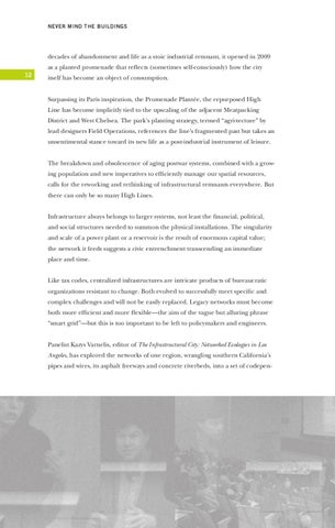 itself has become an object of consumption. Surpassing its Paris inspiration, the Promenade Plantée, the repurposed High Line has become implicitly tied to the upscaling of the adjacent Meatpacking District and West Chelsea. The park’s planting strategy, termed “agri-tecture” by lead designers Field Operations, references the line’s fragmented past but takes an unsentimental stance toward its new life as a post-industrial instrument of leisure. The breakdown and obsolescence of aging postwar systems, combined with a growing population and new imperatives to efficiently manage our spatial resources, calls for the reworking and rethinking of infrastructural remnants everywhere. But there can only be so many High Lines. Infrastructure always belongs to larger systems, not least the financial, political, and social structures needed to summon the physical installations. The singularity and scale of a power plant or a reservoir is the result of enormous capital value; the network it feeds suggests a civic entrenchment transcending an immediate place and time. Like tax codes, centralized infrastructures are intricate products of bureaucratic organizations resistant to change. Both evolved to successfully meet specific and complex challenges and will not be easily replaced. Legacy networks must become both more efficient and more flexible—the aim of the vague but alluring phrase “smart grid”—but this is too important to be left to policymakers and engineers. Panelist Kazys Varnelis, editor of The Infrastructural City: Networked Ecologies in Los Angeles, has explored the networks of one region, wrangling southern California’s pipes and wires, its asphalt freeways and concrete riverbeds, into a set of codepen-