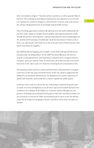 dent “networked ecologies.�3 Varnelis and his coauthors, as well as panelist Marcel Smets in The Landscape of Contemporary Infrastructure, have plotted out an immediate response for architects, designers, and urbanists: to locate, map, and uncover the urban-ecological functions of seemingly impenetrable systems.4 This refreshing approach scrutinizes the physical network itself (traditionally the purview of the engineer) in light of metropolitan and regional priorities (traditionally the purview of the planner), interpreting infrastructural morphologies via the architectural reportage of multiscalar visual documentation. Studies such as these can, and should, elicit both awe at the scale and reach of infrastructure and shock at its inherent fragilities. Interlinking and overlapping, for example, creates both widespread efficiencies and potential cascading failures. In the 2003 Northeast Blackout, the electricity grid’s crash played havoc with dependent communication, sewage-treatment, transport, and water systems. Only six weeks later, all of Italy lost power for twelve hours due to the same cause: tree branches touching faraway transmission lines. Peering deep inside systems to understand their flaws and potentials is not glamorous but it is the first step toward the future of the city, which is supported and defined by accumulated infrastructure. Its deployment is a prime expression of spatial and social life, and reveals how a culture regards the public sphere. It will not, then, come as a shock that the United States collectively spends twice as much on streets and highways as on all other types of networked infrastructure combined. According to Federal Reserve economist Andrew Haughwout, the practice of funding uncoordinated local projects with state and federal dollars creates incentives to overinvest, while state-funded projects often create the illusion of growth by simply encouraging economic activities to move from one place to another.