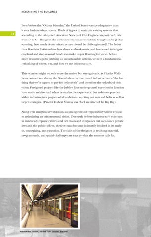 according to the oft-quoted American Society of Civil Engineers report card, rate from D- to C+. But given the environmental unpredictability brought on by global warming, how much of our infrastructure should be civil-engineered? The Indus river floods in Pakistan show how dams, embankments, and levees used to irrigate cropland and stop seasonal floods can make major flooding far worse. Before more resources go to patching up unsustainable systems, we need a fundamental rethinking of where, why, and how we use infrastructure. This exercise might not only serve the nation but strengthen it. As Charles Waldheim pointed out during the Green Infrastructure panel, infrastructure is “the last thing that we’ve agreed to pay for collectively” and therefore the redoubt of civic vision. Farsighted projects like the Jubilee Line underground extension in London have made architectural talent central to the experience, but architects practice within infrastructure projects of all ambitions, working out nuts and bolts as well as larger strategies. (Panelist Hubert Murray was chief architect of the Big Dig). Along with analytical investigation, assuming roles of responsibility will be critical to articulating an infrastructural vision. If we truly believe infrastructure exists not to mindlessly replace culverts and cell masts and overpasses but to enhance private lives and the public sphere, then we must become intimately involved in its analysis, strategizing, and execution. The skills of the designer in resolving material, programmatic, and spatial challenges are exactly what the moment calls for.