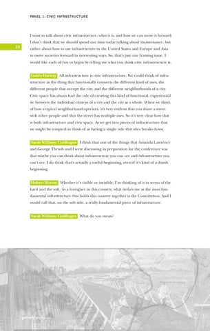 rather about how to use infrastructure in the United States and Europe and Asia to move societies forward in interesting ways. So, that’s just one framing issue. I would like each of you to begin by telling me what you think civic infrastructure is. Guido Hartray All infrastructure is civic infrastructure. We could think of infrastructure as the thing that functionally connects the different kind of uses, the different people that occupy the city, and the different neighborhoods of a city. Civic space has always had the role of creating this kind of functional, experiential tie between the individual citizens of a city and the city as a whole. When we think of how a typical neighborhood operates, it’s very evident that you share a street with other people and that the street has multiple uses. So it’s very clear how that is both infrastructure and civic space. As we get into pieces of infrastructure that we might be tempted to think of as having a single role that idea breaks down. Sarah Williams Goldhagen I think that one of the things that Amanda Lawrence and George Thrush and I were discussing in preparation for the conference was that maybe you can think about infrastructure you can see and infrastructure you can’t see. I do think that’s actually a useful beginning, even if it’s kind of a dumb beginning. Hubert Murray Whether it’s visible or invisible, I’m thinking of it in terms of the hard and the soft. As a foreigner in this country, what strikes me as the most fundamental infrastructure that holds this country together is the Constitution. And I would call that, on the soft side, a really fundamental piece of infrastructure. Sarah Williams Goldhagen What do you mean?