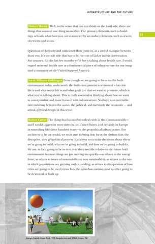 Hubert Murray Well, in the sense that you can think on the hard side, there are things that connect one thing to another. The primary elements, such as buildings, schools, what-have-you, are connected by secondary elements, such as sewers, electricity, and so on. Questions of necessity and sufficiency then come in, as a sort of dialogue between those two. It’s the soft side that has to be the sort of kicker in this conversation. For instance, for the last few months we’ve been talking about health care. I would regard universal health care as a fundamental piece of infrastructure for our imagined community of the United States of America. Sarah Williams Goldhagen Even though we are going to focus on the built environment today, underneath the built environment is a vision of what civic life is and what social life is and what goals are that we want to promote, which is what you’re talking about. This is really essential in thinking about how we want to conceptualize and more forward with infrastructure. So there is an inevitable inter-meshing between the social, the political, and inevitably the economic… and actual, physical design in this sense. Robert Culver The thing that has not been dealt with in this commonwealth— and I would suggest in most states in the United States, and certainly in Europe in something like three hundred years—is the geopolitical infrastructure. For architects to be successful, we must start to bring into focus the dysfunction, the disruptive, slow geopolitical process that allows us to make decisions about where we’re going to build, what we’re going to build, and how we’re going to build it. We are, in fact, going to be in very, very deep trouble relative to the future built environment because things are just moving too quickly—as relates to the energy front, as relates to issues of sustainability or non sustainability, as relates to the way in which populations are growing and expanding, as relates to the question of how cities are going to be used versus how the suburban environment is either going to be destroyed or built up.