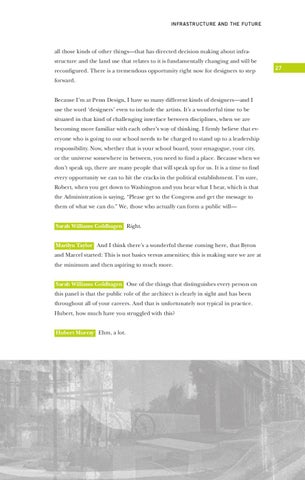 all those kinds of other things—that has directed decision making about infrastructure and the land use that relates to it is fundamentally changing and will be reconfigured. There is a tremendous opportunity right now for designers to step forward. Because I’m at Penn Design, I have so many different kinds of designers—and I use the word ‘designers’ even to include the artists. It’s a wonderful time to be situated in that kind of challenging interface between disciplines, when we are becoming more familiar with each other’s way of thinking. I firmly believe that everyone who is going to our school needs to be charged to stand up to a leadership responsibility. Now, whether that is your school board, your synagogue, your city, or the universe somewhere in between, you need to find a place. Because when we don’t speak up, there are many people that will speak up for us. It is a time to find every opportunity we can to hit the cracks in the political establishment. I’m sure, Robert, when you get down to Washington and you hear what I hear, which is that the Administration is saying, “Please get to the Congress and get the message to them of what we can do.” We, those who actually can form a public will— Sarah Williams Goldhagen Right. Marilyn Taylor And I think there’s a wonderful theme coming here, that Byron and Marcel started: This is not basics versus amenities; this is making sure we are at the minimum and then aspiring to much more. Sarah Williams Goldhagen One of the things that distinguishes every person on this panel is that the public role of the architect is clearly in sight and has been throughout all of your careers. And that is unfortunately not typical in practice. Hubert, how much have you struggled with this? Hubert Murray Ehm, a lot.