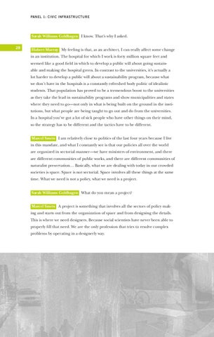 Hubert Murray My feeling is that, as an architect, I can really affect some change in an institution. The hospital for which I work is forty million square feet and seemed like a good field in which to develop a public will about going sustainable and making the hospital green. In contrast to the universities, it’s actually a lot harder to develop a public will about a sustainability program, because what we don’t have in the hospitals is a constantly refreshed body politic of idealistic students. That population has proved to be a tremendous boost to the universities as they take the lead in sustainability programs and show municipalities and states where they need to go—not only in what is being built on the ground in the institutions, but what people are being taught to go out and do from the universities. In a hospital you’ve got a lot of sick people who have other things on their mind, so the strategy has to be different and the tactics have to be different. Marcel Smets I am relatively close to politics of the last four years because I live in this mandate, and what I constantly see is that our policies all over the world are organized in sectorial manner—we have ministers of environment, and there are different communities of public works, and there are different communities of naturalist preservation… Basically, what we are dealing with today in our crowded societies is space. Space is not sectorial. Space involves all these things at the same time. What we need is not a policy, what we need is a project. Sarah Williams Goldhagen What do you mean a project? Marcel Smets A project is something that involves all the sectors of policy making and starts out from the organization of space and from designing the details. This is where we need designers. Because social scientists have never been able to properly fill that need. We are the only profession that tries to resolve complex problems by operating in a designerly way.