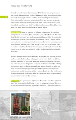 had lunch every couple of weeks—and the environmental protection agency. There is this kind of interconnectedness that is both necessary and can also get out of control politically, I think particularly in this country. Now in the United States, I still can’t figure out why it’s so difficult to do what you, Marcel, have done as the czar of the built environment in the Flemish region. Guido Hartray Just as an example, we did some work with the Metropolitan Transportation Association (MTA), which has a goal in New York state that something like fifty percent of new development would happen within the radius of a transit stop to promote transit-oriented development. The MTA is great in that respect, but then when they go to implementation, they have to look at implementation from the point of view of ‘these are the parts of the city we control.’ And so, you have something that’s incredibly ambitious, but obviously the parcels they control are never going to result in that kind of ambitious goal that they set for themselves. It relates exactly to the questions of sectorial division. Because once the problem has been put in the field of a specific agency and they have drafted an RFP that you have responded to, the design problem is probably already gone. The question is how you get into this position where you are the steward that has to bridge between these agencies. That gets messy for the person who ends up being your client because here they’ve gone through the whole process to neatly define a problem, and hand it to you, the architect, to solve. But, in fact, that whole process of neatly defining the problem was really excluding most of the really interesting and innovative solutions to that problem. Byron Stigge The question to us right now is, ‘What is the role of the architect?’ And, ‘Why is it so hard in the US, and why are we struggling so much?’ The best architects structure a compelling argument that develops a good civic infrastruc-