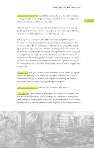 Sarah Williams Goldhagen I would object to that. Look at the Millennium Park in Chicago which was a public-private thing and in which there were millions and millions of dollars poured into the civic realm. I do think that one of the focal points is that the Federal Government is doing good things but there has to be some way of getting it down to a regional level and a regional vision. Politically, that is a very difficult thing to do. Picking up on the constitution, which Hubert was exactly right bring to the forefront, I’m not interested in the American bashing, as in ‘Americans are bad people and selfish.’ I don’t think they are and I think that’s wrong. What I’m trying to get at and figure out—and I think we are getting somewhere—is what are the structural issues that make it so difficult for long-term visions about civic good to be implemented through infrastructural initiatives in the United States, and to some extent in Western Europe? I don’t think it’s necessarily a lack of will on the individual basis, but there is something there, whether it’s a political structure or the training of architects. Somehow it needs to be addressed and reconceptualized in useful ways. Marcel Smets FDR generated the community of this country and he did it politically. He did it through the WPA with photographers and artists and writers, so that the entire country felt that they were engaged in rebuilding the common infrastructure. Why aren’t we engaging in the public purpose? Sarah Williams Goldhagen That’s a pivotal question. Why aren’t we? Marilyn Taylor I have one theory. Having watched Europe, where there is European Union investment bank, having watched China, where there is the government, having watched Singapore, where there is a government that is so wise in its investments and its structure of the related development that is also in the network