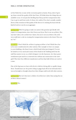 available to me, it’s not just the dwelling that I keep and the transportation that I use to get to and from work, it’s those civic outlets. If we don’t actually consider them as this extension of this quality of life then we’re missing the boat with the kind of work we can do as an aggregate. Tom Keane Will, I’m going to make you answer this question specifically with respect to transportation, since that’s been your focus. You’re not an architect. You may have taken a few architecture classes, but you’re not an architect. Do architects really have a role in creating the transportation system in the future? You can say “no.” Will Lark I don’t think the architect is going to define it, but I think there has to be some consideration for other systems. One example we have on campus is a new building—the Stata Center, which Frank Gehry just designed. I’m sure he looked at every nook and cranny of the details in the building itself, but the stuff that matters to me as a vehicle designer is in the basement. Are those power transformers just stuck in a cemented area without any connection to the outer grid? They have four different transformers and less than half of them are used at a time. One of the big issues we have with electric vehicles is being able to rapidly charge them. Transformers are the perfect thing to piggy back off of, but obviously there was no foresight or thought about how these things could work with other systems. Tom Keane But isn’t that more a failure of architecture rather than saying that an architect doesn’t matter? Will Lark Yes.