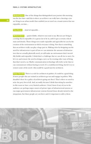 are living in an urban model that enabled you to travel on a transit system that was enjoyable, on time… Tom Keane …kind of enjoyable… Michael Jones …quasi-reliable, whatever you want to say. But you are living in a setting that is enjoyable; it’s a great city to be in, and it’s got a certain critical mass and density. Those things were made enjoyable and agreeable for you by the creation of the environment in which everyone is living. Now that is something that an architect really can play a huge part in. Making cities by designing out the need for infrastructure is part of how we can minimize the amount of infrastructure that we actually physically need, yet still make an environment that’s incredibly livable and enjoyable. I think that’s a challenge that we can all rise to meet. So let’s try and remove the need to design a new car by creating other ways of living that don’t need a car. Maybe communication technology will evolve so far that we can communicate without having to travel. It’s a multifaceted thing, but let’s try to remove some of the need—this would be a good start for architects. Kazys Varnelis There is a role for architects in politics. It could be a good thing if more people who are trained as architects go out and engage in politics. Why shouldn’t there be a policy of architects going out there? That’s where we need to seize the prey, first of all. And, secondly, because I think that sitting by ourselves in this room we have a very limited audience. I don’t know if any of you in the audience are perhaps major owners of private types of infrastructural systems or run major government infrastructure systems beyond those already invited to the symposium, but those people are out there and it’s important to talk to them.