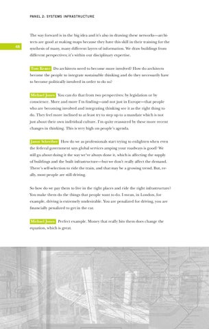 synthesis of many, many different layers of information. We draw buildings from different perspectives; it’s within our disciplinary expertise. Tom Keane Do architects need to become more involved? How do architects become the people to integrate sustainable thinking and do they necessarily have to become politically involved in order to do so? Michael Jones You can do that from two perspectives: by legislation or by conscience. More and more I’m finding—and not just in Europe—that people who are becoming involved and integrating thinking see it as the right thing to do. They feel more inclined to at least try to step up to a mandate which is not just about their own individual culture. I’m quite reassured by these more recent changes in thinking. This is very high on people’s agenda. Jason Schreiber How do we as professionals start trying to enlighten when even the federal government says global services amping your roadways is good? We still go about doing it the way we’ve always done it, which is affecting the supply of buildings and the built infrastructure—but we don’t really affect the demand. There’s self-selection to ride the train, and that may be a growing trend. But, really, most people are still driving. So how do we pay them to live in the right places and ride the right infrastructure? You make them do the things that people want to do. I mean, in London, for example, driving is extremely undesirable. You are penalized for driving, you are financially penalized to get in the car. Michael Jones Perfect example. Money that really hits them does change the equation, which is great.