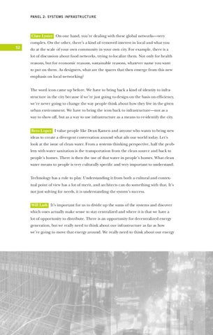 do at the scale of your own community in your own city. For example, there is a lot of discussion about food networks, trying to localize them. Not only for health reasons, but for economic reasons, sustainable reasons, whatever name you want to put on them. As designers, what are the spaces that then emerge from this new emphasis on local networking? The word icon came up before. We have to bring back a kind of identity to infrastructure in the city because if we’re just going to design on the basis on efficiency, we’re never going to change the way people think about how they live in the given urban environment. We have to bring the icon back to infrastructure—not as a way to show off, but as a way to use infrastructure as a means to re-identify the city. Beto Lopez I value people like Dean Kamen and anyone who wants to bring new ideas to create a divergent conversation around what ails our world today. Let’s look at the issue of clean water. From a systems thinking perspective, half the problem with water sanitation is the transportation from the clean source and back to people’s homes. There is then the use of that water in people’s homes. What clean water means to people is very culturally specific and very important to understand. Technology has a role to play. Understanding it from both a cultural and contextual point of view has a lot of merit, and architects can do something with that. It’s not just solving for needs, it is understanding the system’s success. Will Lark It’s important for us to divide up the sums of the systems and discover which ones actually make sense to stay centralized and where it is that we have a lot of opportunity to distribute. There is an opportunity for decentralized energy generation, but we really need to think about our infrastructure as far as how we’re going to move that energy around. We really need to think about our energy