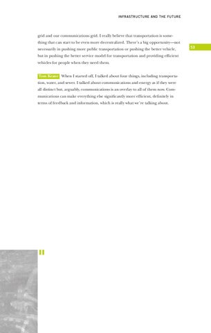 grid and our communications grid. I really believe that transportation is something that can start to be even more decentralized. There’s a big opportunity—not necessarily in pushing more public transportation or pushing the better vehicle, but in pushing the better service model for transportation and providing efficient vehicles for people when they need them. Tom Keane When I started off, I talked about four things, including transportation, water, and sewer. I talked about communications and energy as if they were all distinct but, arguably, communications is an overlay to all of them now. Communications can make everything else significantly more efficient, definitely in terms of feedback and information, which is really what we’re talking about.