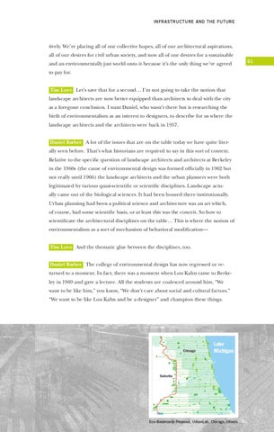 tively. We’re placing all of our collective hopes, all of our architectural aspirations, all of our desires for civil urban society, and now all of our desires for a sustainable and an environmentally just world onto it because it’s the only thing we’ve agreed to pay for. Tim Love Let’s save that for a second… I’m not going to take the notion that landscape architects are now better equipped than architects to deal with the city as a foregone conclusion. I want Daniel, who wasn’t there but is researching the birth of environmentalism as an interest to designers, to describe for us where the landscape architects and the architects were back in 1957. Daniel Barber A lot of the issues that are on the table today we have quite literally seen before. That’s what historians are required to say in this sort of context. Relative to the specific question of landscape architects and architects at Berkeley in the 1960s (the cause of environmental design was formed officially in 1962 but not really until 1966) the landscape architects and the urban planners were both legitimated by various quasi-scientific or scientific disciplines. Landscape actually came out of the biological sciences. It had been housed there institutionally. Urban planning had been a political science and architecture was an art which, of course, had some scientific basis, or at least this was the conceit. So how to scientificate the architectural disciplines on the table… This is where the notion of environmentalism as a sort of mechanism of behavioral modification— Tim Love And the thematic glue between the disciplines, too. Daniel Barber The college of environmental design has now regressed or returned to a moment. In fact, there was a moment when Lou Kahn came to Berkeley in 1969 and gave a lecture. All the students are coalesced around him, “We want to be like him,” you know, “We don’t care about social and cultural factors.” “We want to be like Lou Kahn and be a designer” and champion these things.