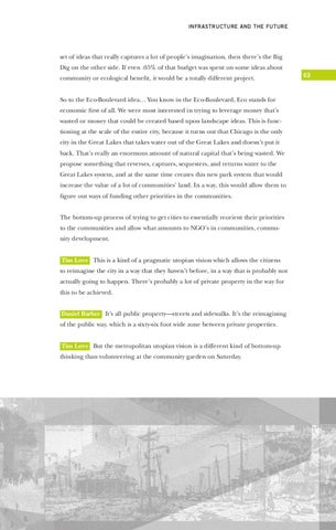 set of ideas that really captures a lot of people’s imagination, then there’s the Big Dig on the other side. If even .05% of that budget was spent on some ideas about community or ecological benefit, it would be a totally different project. So to the Eco-Boulevard idea… You know in the Eco-Boulevard, Eco stands for economic first of all. We were most interested in trying to leverage money that’s wasted or money that could be created based upon landscape ideas. This is functioning at the scale of the entire city, because it turns out that Chicago is the only city in the Great Lakes that takes water out of the Great Lakes and doesn’t put it back. That’s really an enormous amount of natural capital that’s being wasted. We propose something that reverses, captures, sequesters, and returns water to the Great Lakes system, and at the same time creates this new park system that would increase the value of a lot of communities’ land. In a way, this would allow them to figure out ways of funding other priorities in the communities. The bottom-up process of trying to get cities to essentially reorient their priorities to the communities and allow what amounts to NGO’s in communities, community development. Tim Love This is a kind of a pragmatic utopian vision which allows the citizens to reimagine the city in a way that they haven’t before, in a way that is probably not actually going to happen. There’s probably a lot of private property in the way for this to be achieved. Daniel Barber It’s all public property—streets and sidewalks. It’s the reimagining of the public way, which is a sixty-six foot wide zone between private properties. Tim Love But the metropolitan utopian vision is a different kind of bottom-up thinking than volunteering at the community garden on Saturday.