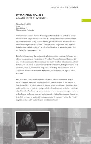 November 21, 2009 9 am West Village F Northeastern University “Infrastructure and the Future: Assessing the Architect’s Role” is the first conference in a series organized by the School of Architecture at Northeastern addressing real-world issues facing architects today, particularly issues that span the academic and the professional realms. Our larger aim is to question, and hopefully broaden, our understanding of the role of architecture in addressing issues that are facing the contemporary city. But why infrastructure? Certainly this is a hot topic at the moment. Infrastructure, of course, was a central component of President Obama’s Stimulus Plan, and The New York Times annual architecture issue this year focused on infrastructure. Closer to home, we see panels at various architectural conferences, both professional and academic, issues of journals and magazines—including the most recent issue of Architecture Boston—and symposia like this one, all addressing the topic of infrastructure. But, as we were conceptualizing this conference, it seemed to us that none of these were really asking the crucial question: “What is the role of the architect?” Whether publicly or privately funded, architects have traditionally participated in major publics works projects—designs of schools, rail stations, and other buildings of public utility. While such projects continue to have value, the emergence of new technologies, settlement patterns, and economic relationships mandate that architects find new ways to participate in contemporary debates over where the country might most rationally and profitably invest in the future.