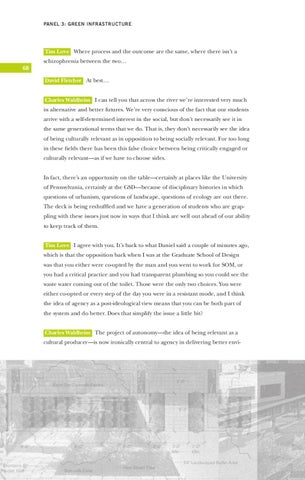 David Fletcher At best… Charles Waldheim I can tell you that across the river we’re interested very much in alternative and better futures. We’re very conscious of the fact that our students arrive with a self-determined interest in the social, but don’t necessarily see it in the same generational terms that we do. That is, they don’t necessarily see the idea of being culturally relevant as in opposition to being socially relevant. For too long in these fields there has been this false choice between being critically engaged or culturally relevant—as if we have to choose sides. In fact, there’s an opportunity on the table—certainly at places like the University of Pennsylvania, certainly at the GSD—because of disciplinary histories in which questions of urbanism, questions of landscape, questions of ecology are out there. The deck is being reshuffled and we have a generation of students who are grappling with these issues just now in ways that I think are well out ahead of our ability to keep track of them. Tim Love I agree with you. It’s back to what Daniel said a couple of minutes ago, which is that the opposition back when I was at the Graduate School of Design was that you either were co-opted by the man and you went to work for SOM, or you had a critical practice and you had transparent plumbing so you could see the waste water coming out of the toilet. Those were the only two choices. You were either co-opted or every step of the day you were in a resistant mode, and I think the idea of agency as a post-ideological view means that you can be both part of the system and do better. Does that simplify the issue a little bit? Charles Waldheim The project of autonomy—the idea of being relevant as a cultural producer—is now ironically central to agency in delivering better envi-