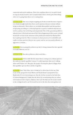 ronmental and social conditions. That’s the condition that we’re in and it’s hard to wrap my head around it, but I certainly think it does a better job of describing where we’re going than where we’re coming from. Daniel Barber One way to begin wrapping our heads around this issue of agency is to think through exactly how there can be practices that are resistant without being revolutionary. This is where we can think about politics and this question of operating according to a critical perspective on power conditions that has not tried to coalesce, but to develop tactical potential. One of the potential parallels to infrastructure is this food movement that’s been happening in this country around local food—at least in the attention to the production of food that Michael Pollan is spokesperson for. There’s resistance in those practices. It is imbedded and explicit in those practices that are not counter and are not necessarily offensive or aggressive or violent… Tim Love Post avant-garde architects say they’re being resistant but their agenda is actually different, isn’t it? Daniel Barber You take architects at their word then… Cliff McMillan I feel a little like the visitor that is coming in to a dinner party in the midst of a family squabble. I mean, it’s really important what you’re talking about and I believe in it. But guys, the project of saving the planet is bigger than this squabble—get out there and do it together. Tim Love Sure. Yeah. Here, here. I think we’re all for that, by the way. This is one of the perspectives from Martin and Sarah Dunne’s proposal for EcoBoulevards. It’s very interesting to me that the city has recessed so far back that it’s almost disappeared. I think that the driver for reenvisioning what our urban environment is does require a balance, that’s all. The dial can’t be too far turned to the ecological and it can’t be turned too far to the idea that metropolitan cul-